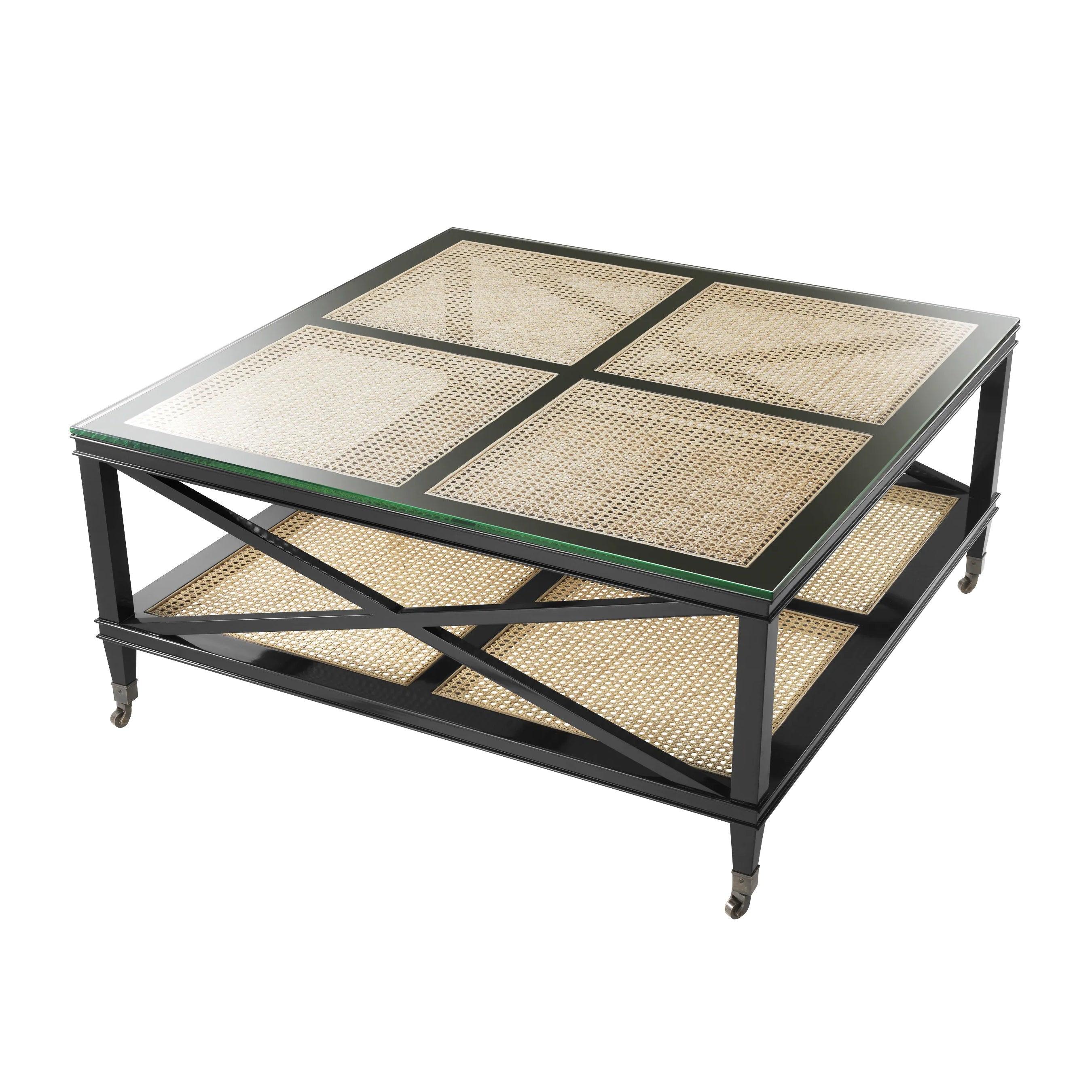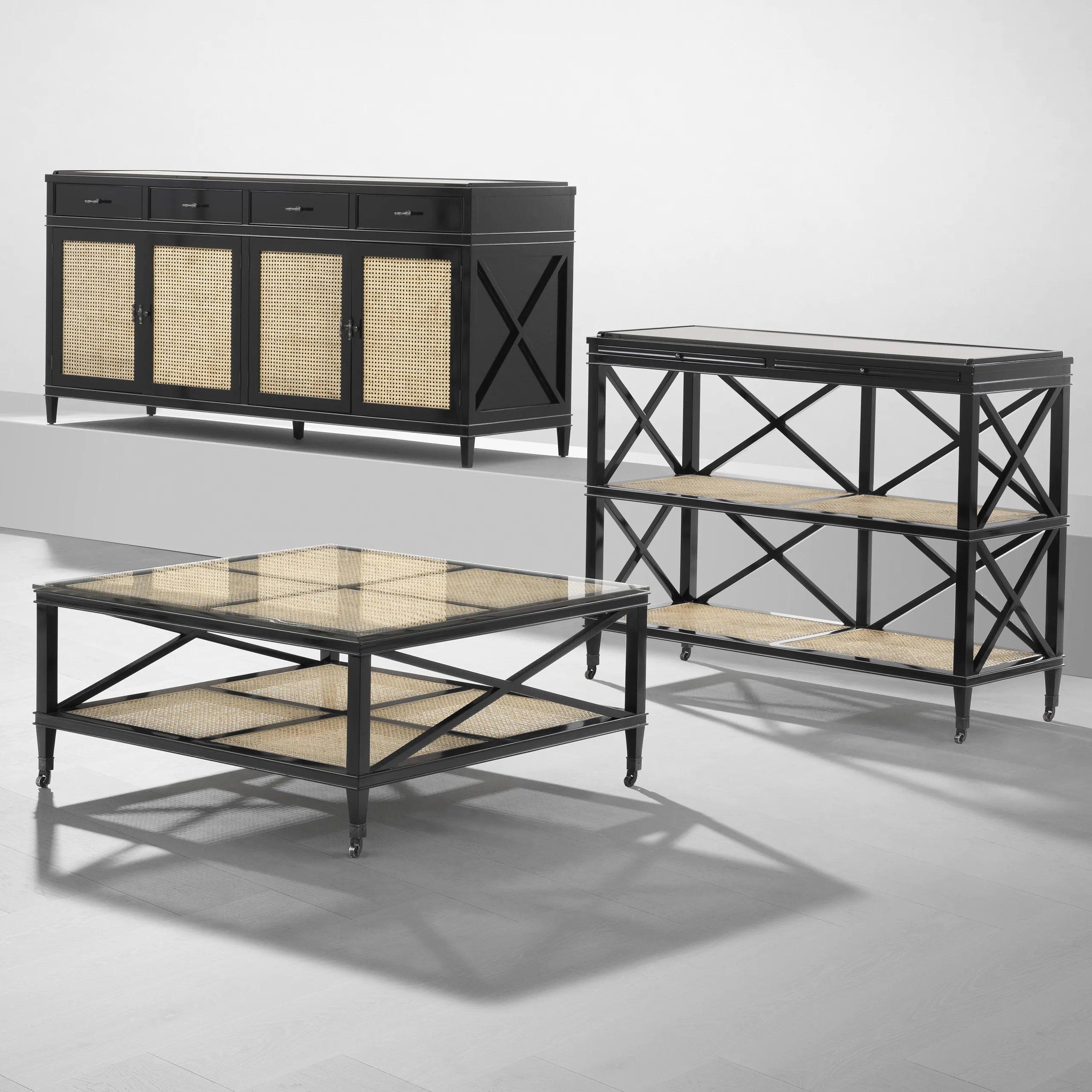 Table It consists of a wooden frame made of a black mahogany. This combination of classic material with a modern accent gives the furniture a unique character. The frame is a solid support for the table tops, creating a coherent structure. The table top and the bottom shelf are made of natural sugar cane mesh, which refers to exotic Caribbean motifs and adds heat to the furniture. The transparent glass that covers the countertop introduces an element of lightness and allows you to admire the detail of the mesh and the wooden frame.