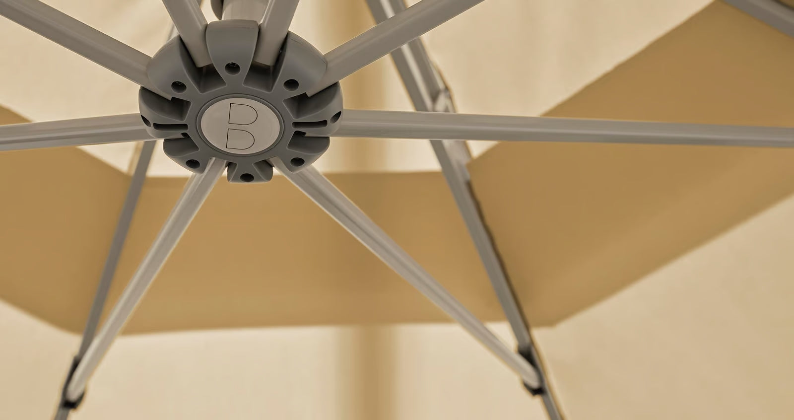 Umbrella Cape is a modern garden or terrace solution, distinguished by a large, round roof. The innovative side frame ensures maximum space efficiency, enabling free arrangement of furniture without disturbing central column. The adjustable the angle of the canopy allows you to easily adjust umbrella to the position of the sun, providing optimal shade throughout the day. The umbrella structure has been designed for air circulation, thanks to which a delicate breeze can flow freely, providing comfort on hot days. Umbrella Cape is equipped with a protective cover, and its light, but durable aluminum frame guarantees multi -season strength and elegant look.