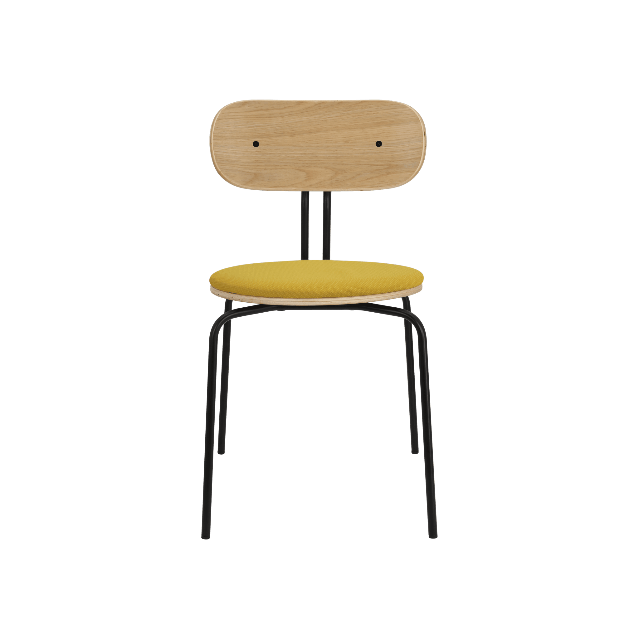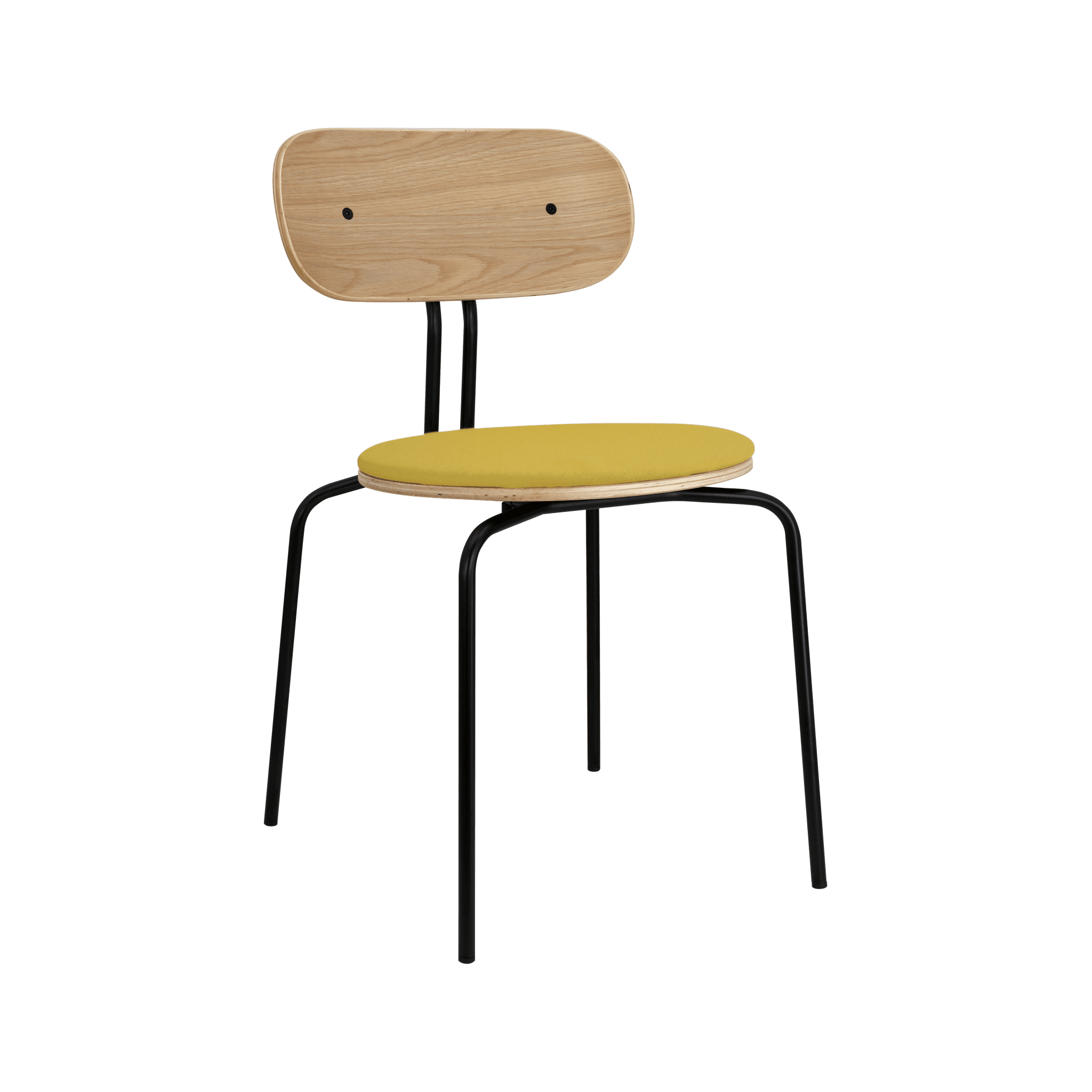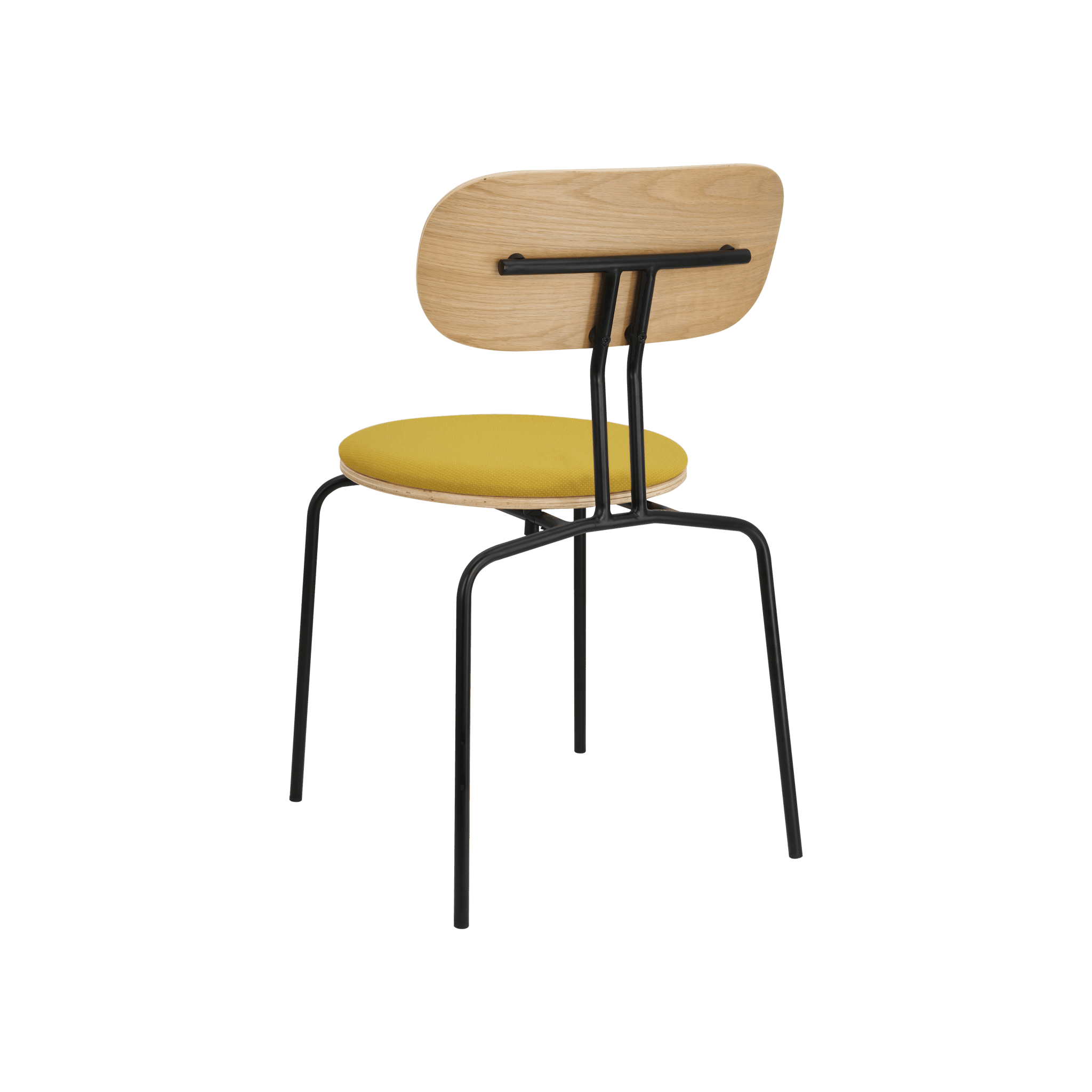 Chair Curious is elegant, light and minimalist furniture, made of oak veneer. It is available with brass or black legs, and the optional seat cushion provides additional comfort. You can choose a pillow from 17 colors of Horizons fabric, made 100% recycled, as well as in a brown or white shade of Teddy Bear fabric.