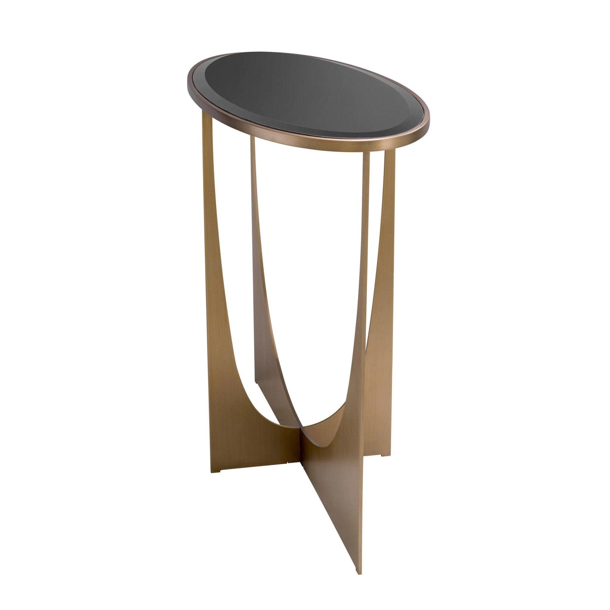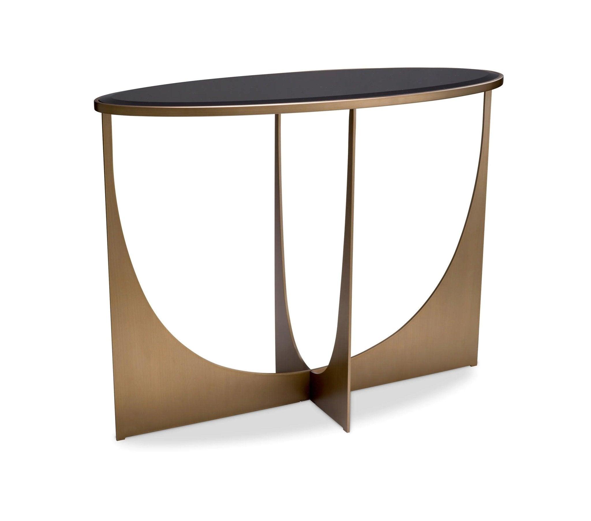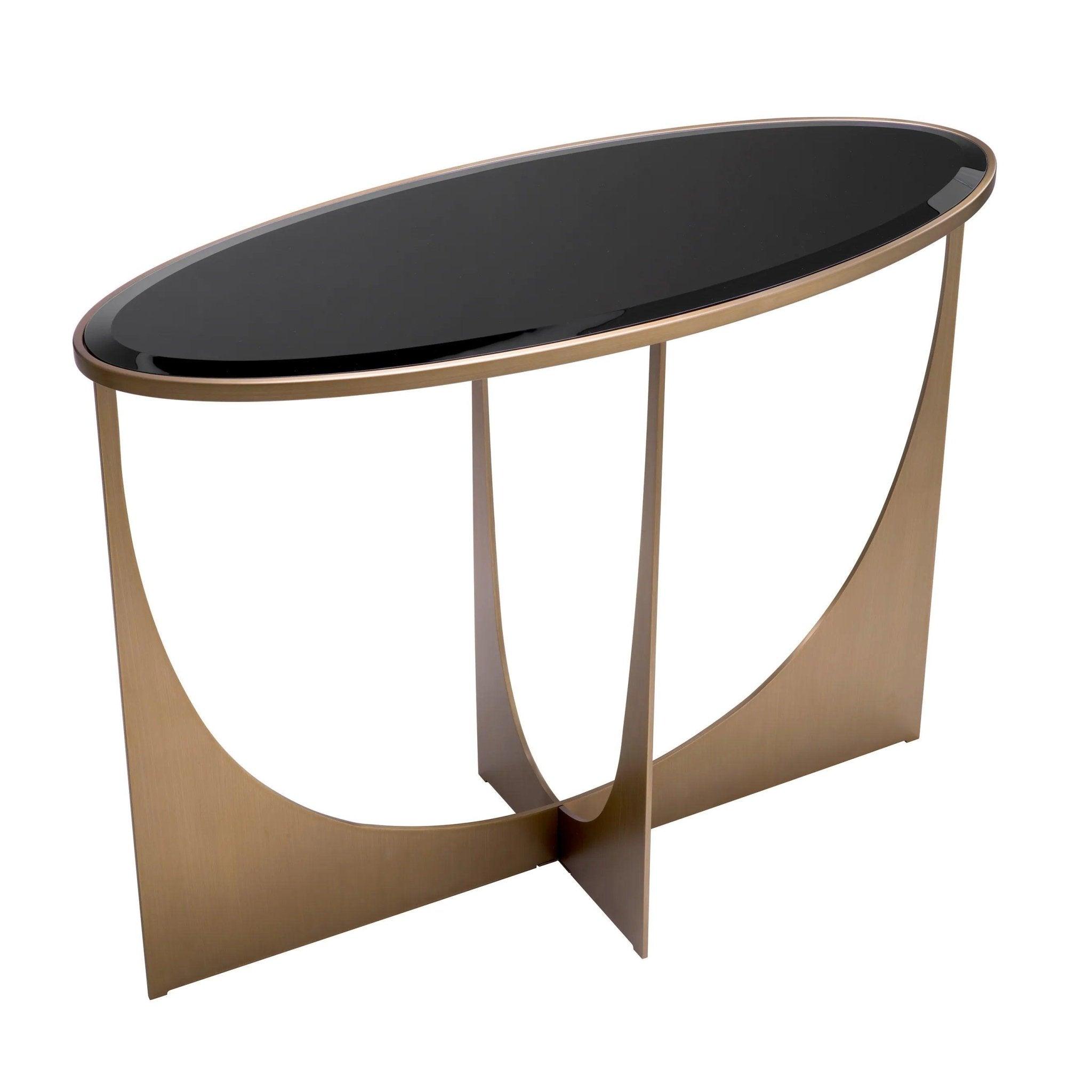 The brushed brass finish emphasizes the elegant curvature of the table, giving it a special glow. The metal design of the console is both solid and designer, which makes the furniture not only functional, but also a work of art. The chapted black glass top is an expression of modernity, which adds the console character and style. It is an ideal place to display decorations, works of art or favorite items.