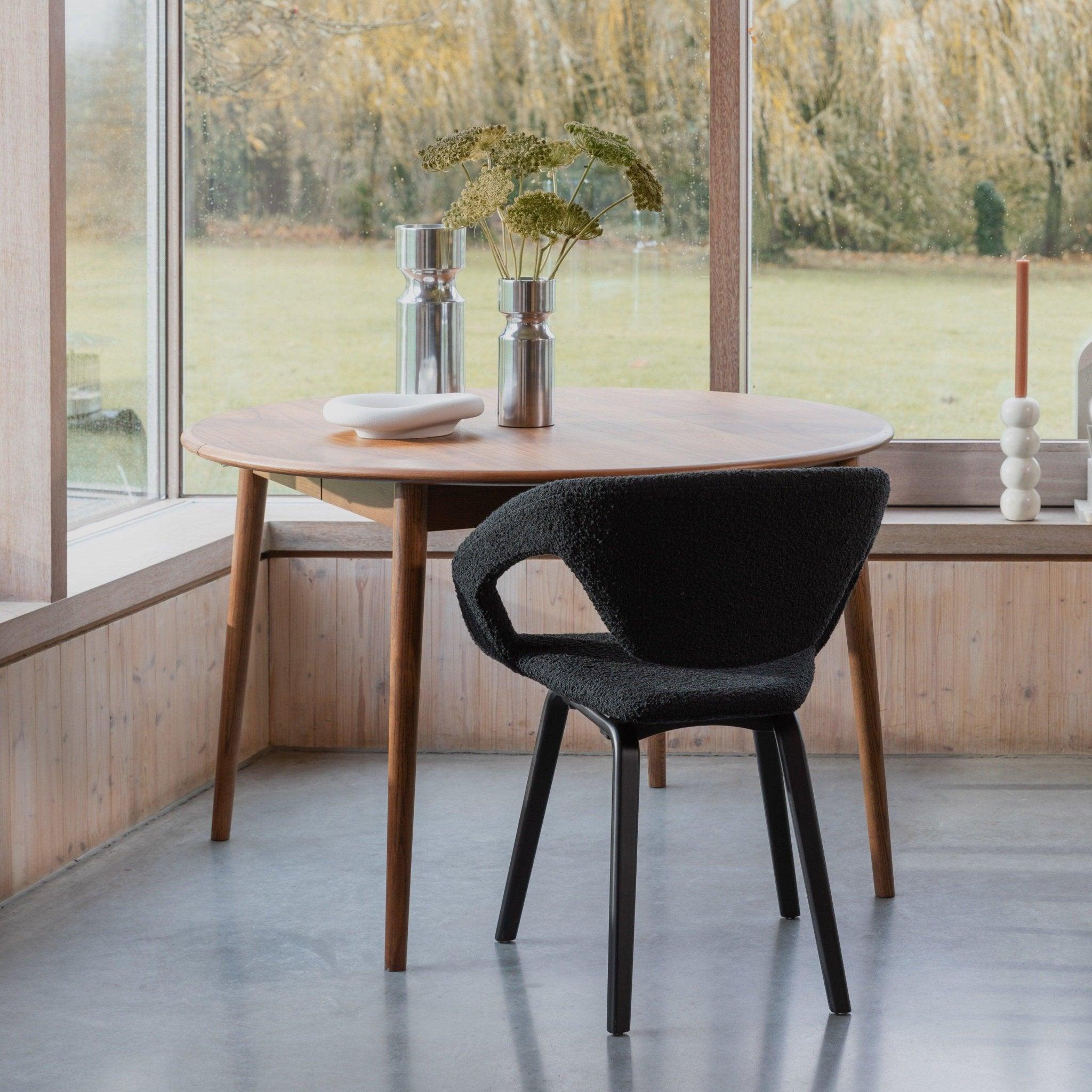 The seat with Bouclé upholstery provides a comfortable seat. The base is made of beech wood.
