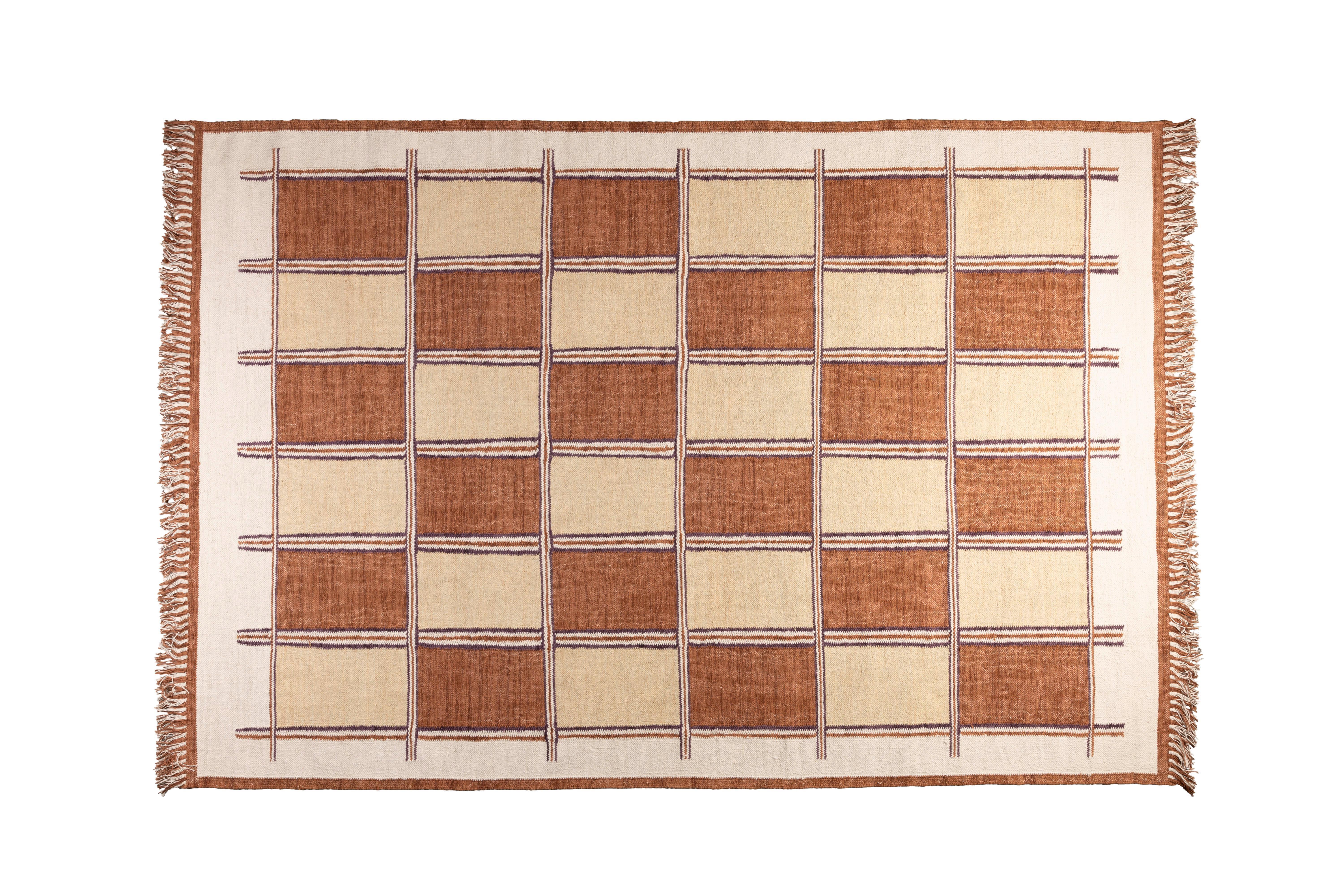 Do you want to add more heat and character to your interior? Rug Gambit will be a great solution. This unique carpet He immediately introduces a striking, retro atmosphere to your home thanks to the woven cotton, which creates a pattern of joyful colors. Beige and orange blocks are intertwined with a purple line pattern, creating a checkerboard -like appearance. The fringes at the ends add a pleasant vintage atmosphere, and despite the references to the 70s, the Gambit rug is completely modern.