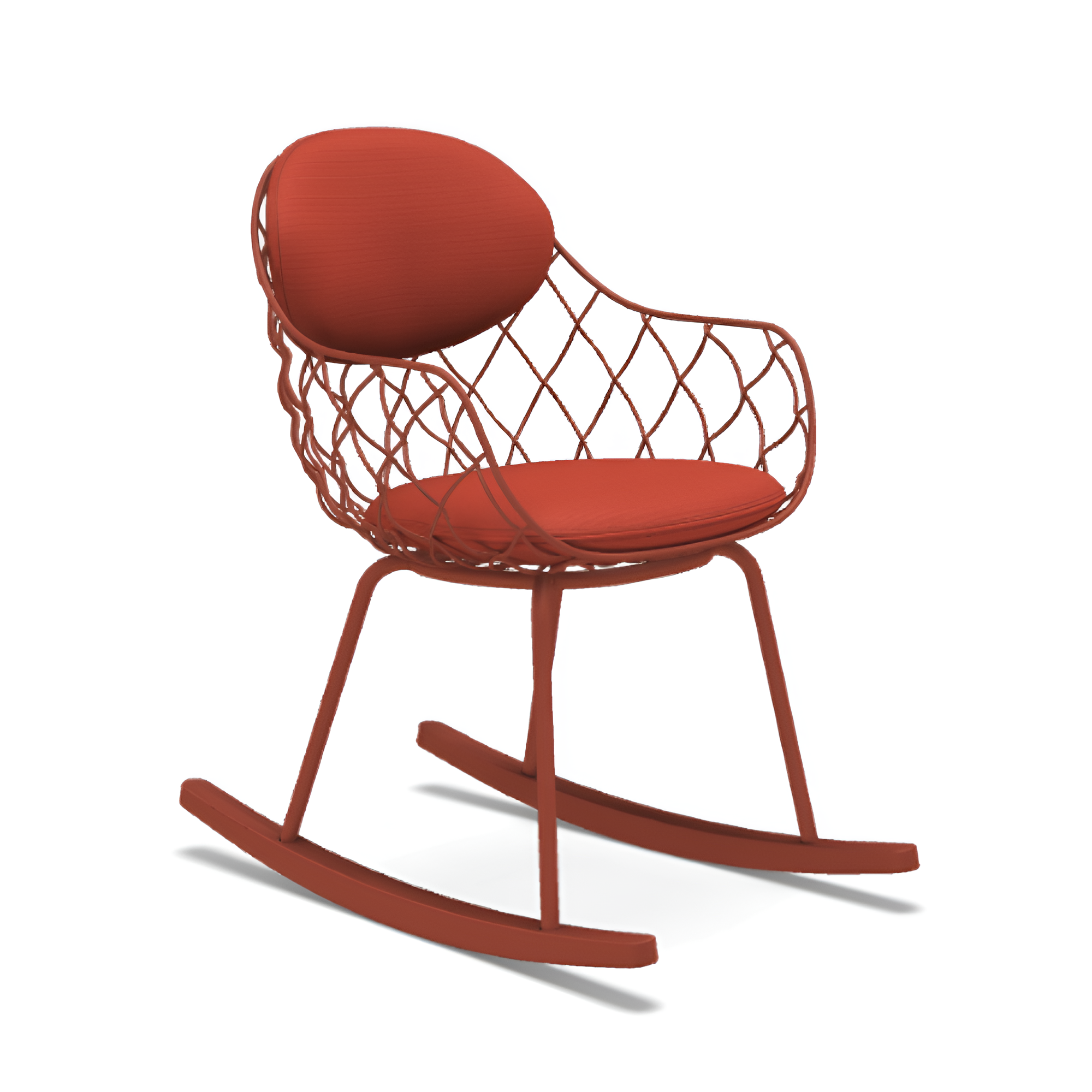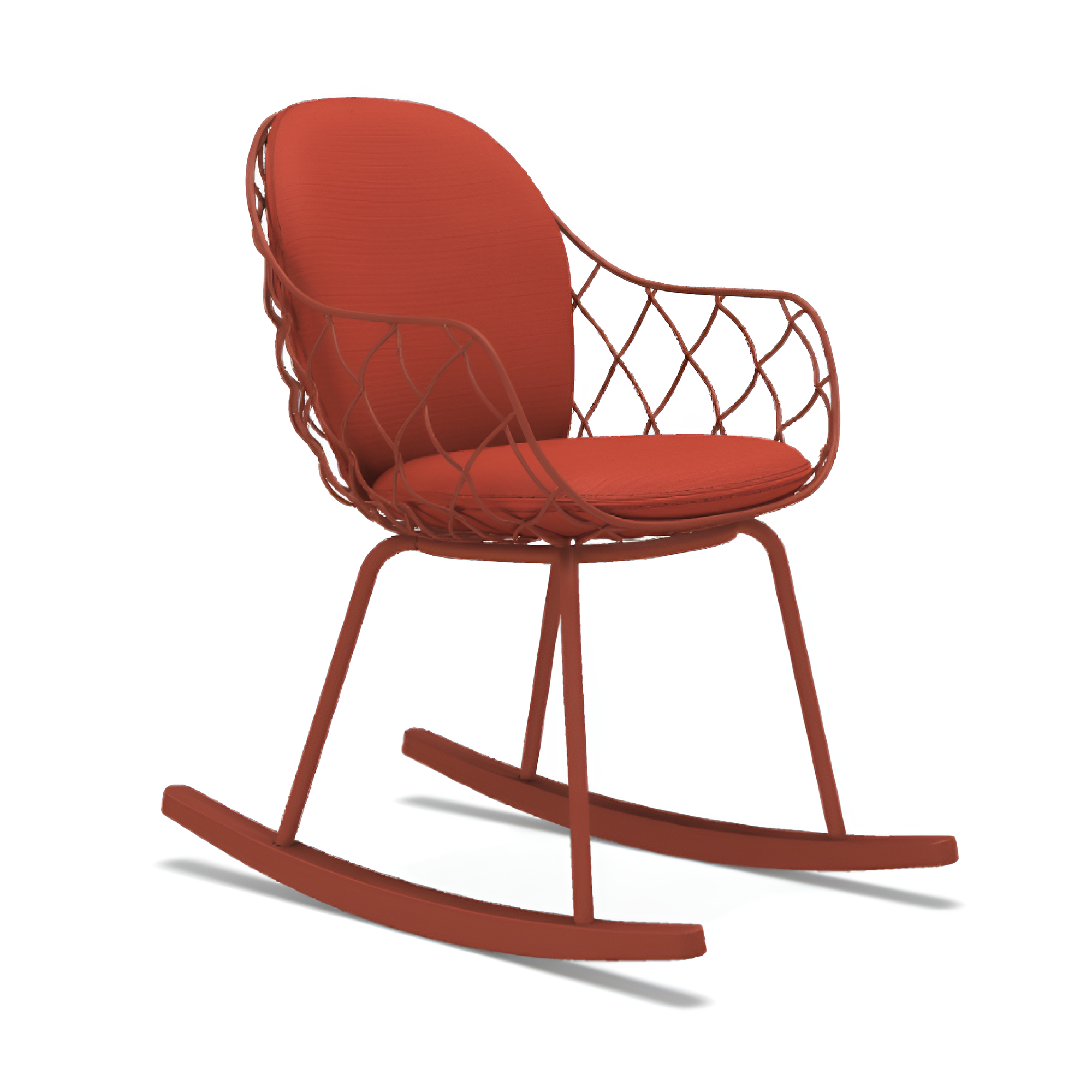 Rocking Chair Piña, designed by Jaime Hayón for the brand Magis, is a unique blend of contemporary design and timeless form. The airy backrest structure made of powder-coated steel rods references the structure of a pineapple – the signature of the entire collection. The characteristic, curved runners made of solid ash wood give the chair a visual lightness and allow for gentle rocking, introducing an element of relaxation into everyday use.