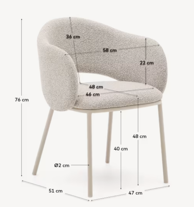 The Maina chair is a blend of elegance, comfort, and timeless design. Its shape, inspired by the aesthetics of the 1950s, is enhanced with contemporary details, making the upholstered Maina chair a perfect fit for modern interiors with a touch of retro. The beige chenille fabric with a distinct texture adds warmth, while the gentle lines and contoured backrest ensure top-level comfort.