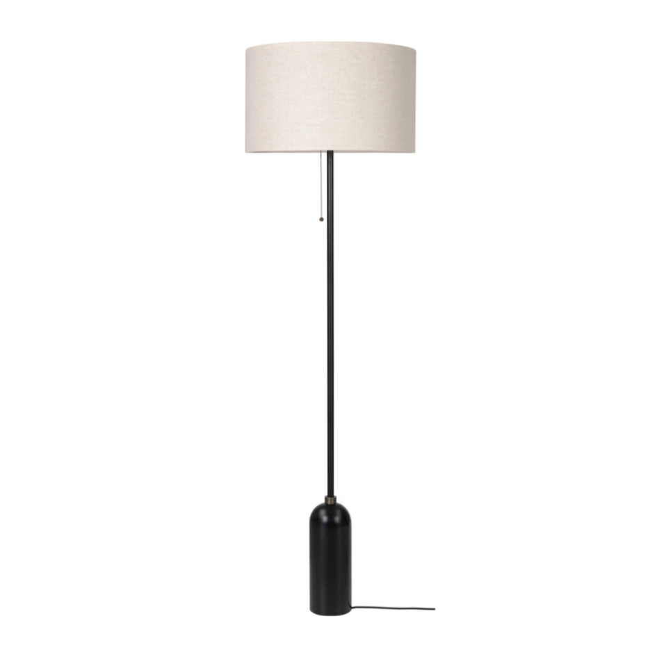 The Gravity floor lamp is an icon of modern design by the duo Space Copenhagen. Its design is based on a striking contrast between the heavy, cylindrical base and the light, textile shade. This play of proportions allows the lamp to create a cohesive, sculptural form that draws the eye without dominating the space.