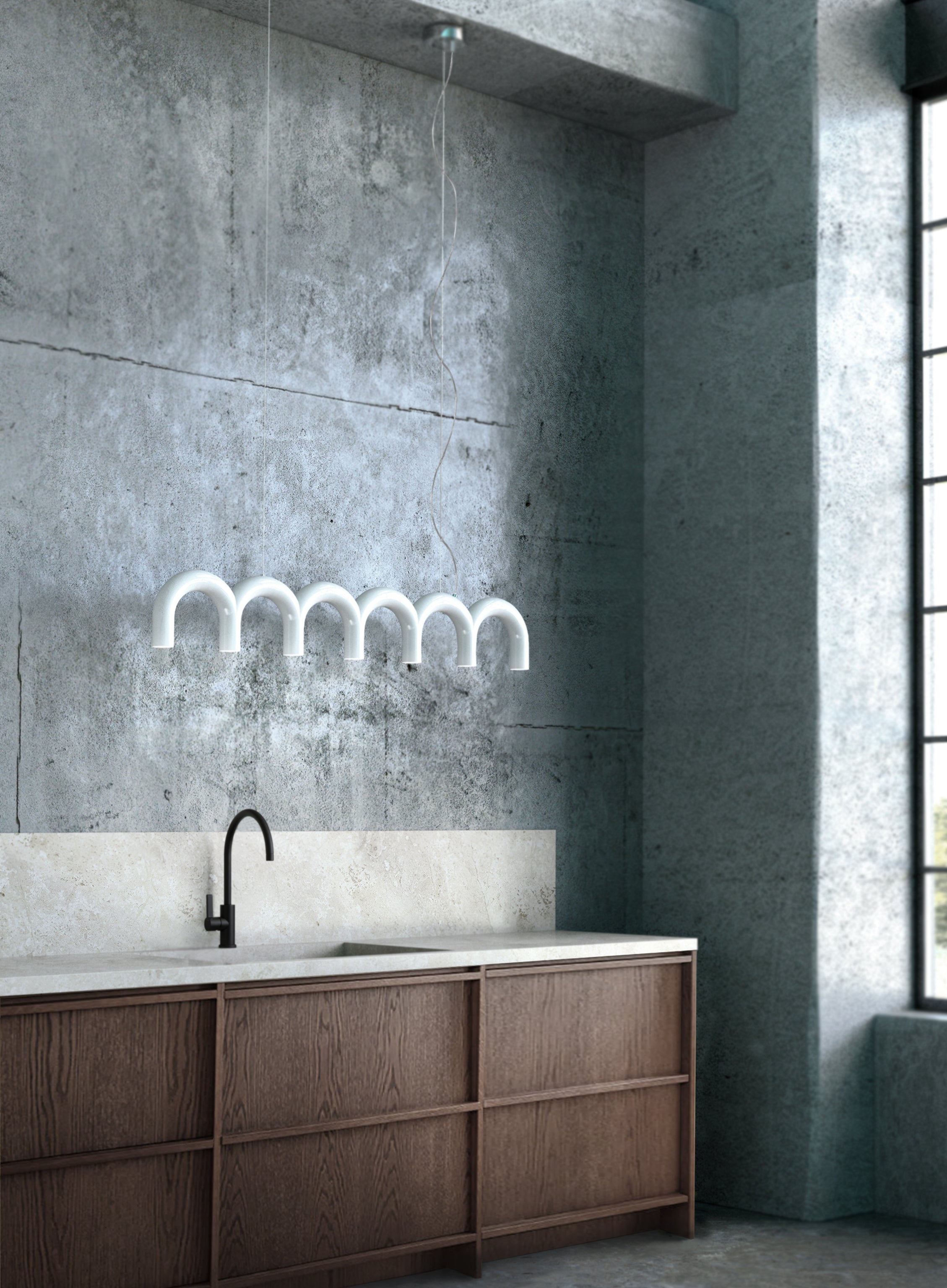 Each of the seven light points provides precise, downward-directed light, ideal for illuminating work and utility surfaces. The solid steel construction, glossy finish, and the option to choose the color make the pendant lamp Arch Straight a proposal for those who value quality, aesthetics, and functionality in one. This lighting combines modern design with the timeless charm of architectural form.