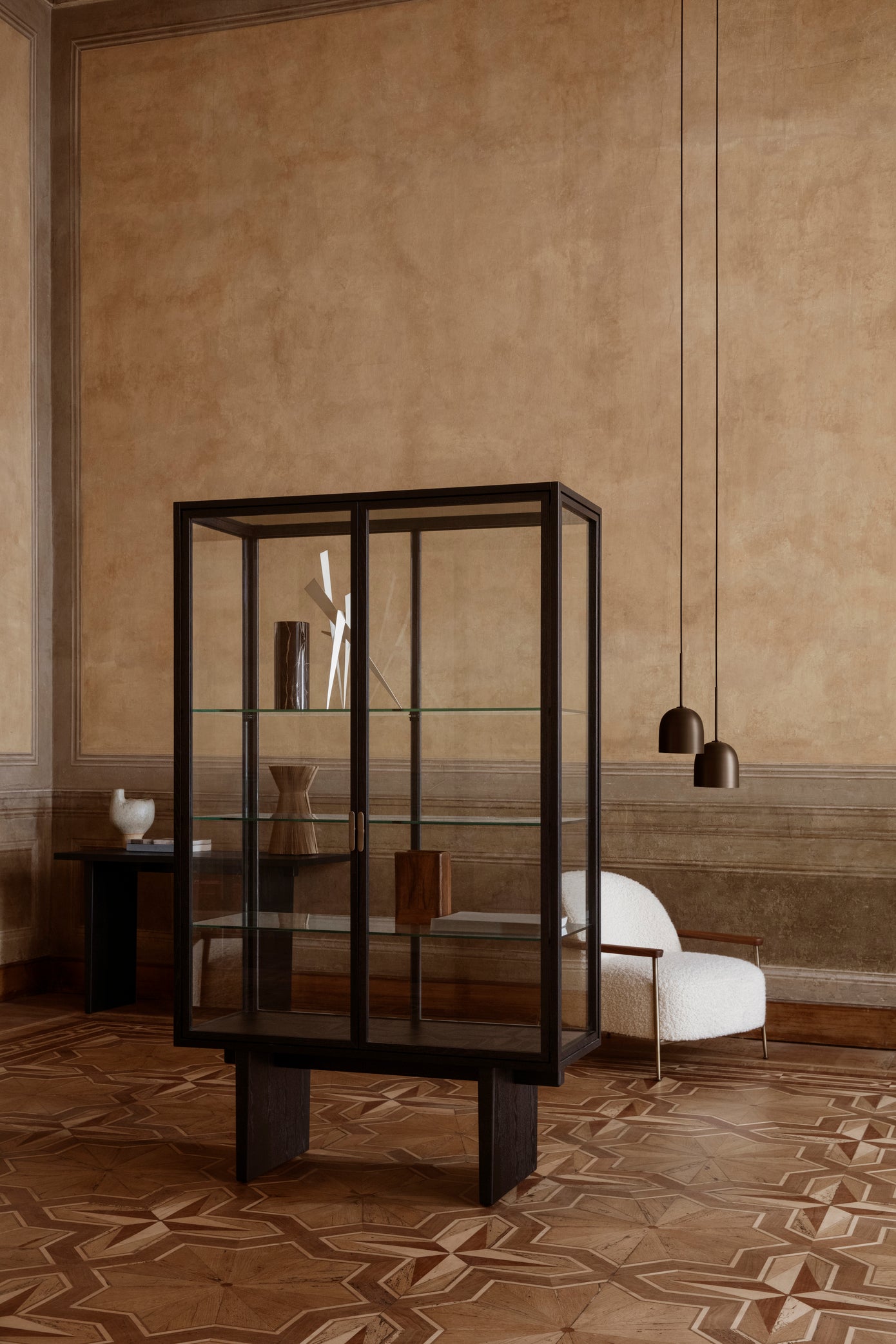 The shade, made of brass with a gunmetal finish and a brushed brass interior, emits concentrated, atmospheric light, adding coziness to the interior.