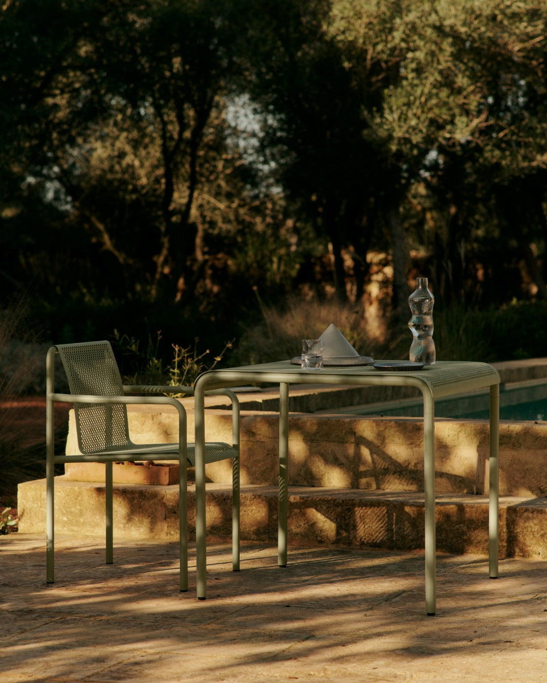 Bench Dapple draws inspiration from the gentle light filtering through leaves – its airy structure and subtle perforation bring tranquility and a natural rhythm to the space. Made of galvanized steel and powder-coated, it is perfect for the terrace, balcony, or garden, offering durability and resistance to weather conditions.