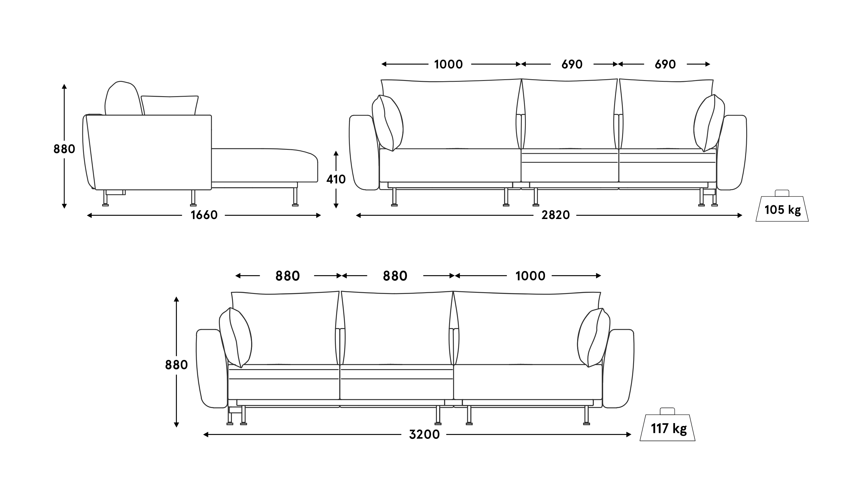 Pillows made of cut silicone and polyurethane foam at the same time ensure softness and fluffiness of the backrest as well as its adequate volume and elasticity. Fabric laminating it prevents it from wrinkling and deformation, thanks to which even after long use the sofa looks like new. Metal feet with felt pads ensure stabilization of the seat on any ground and protect against the scratch of the floor surface.