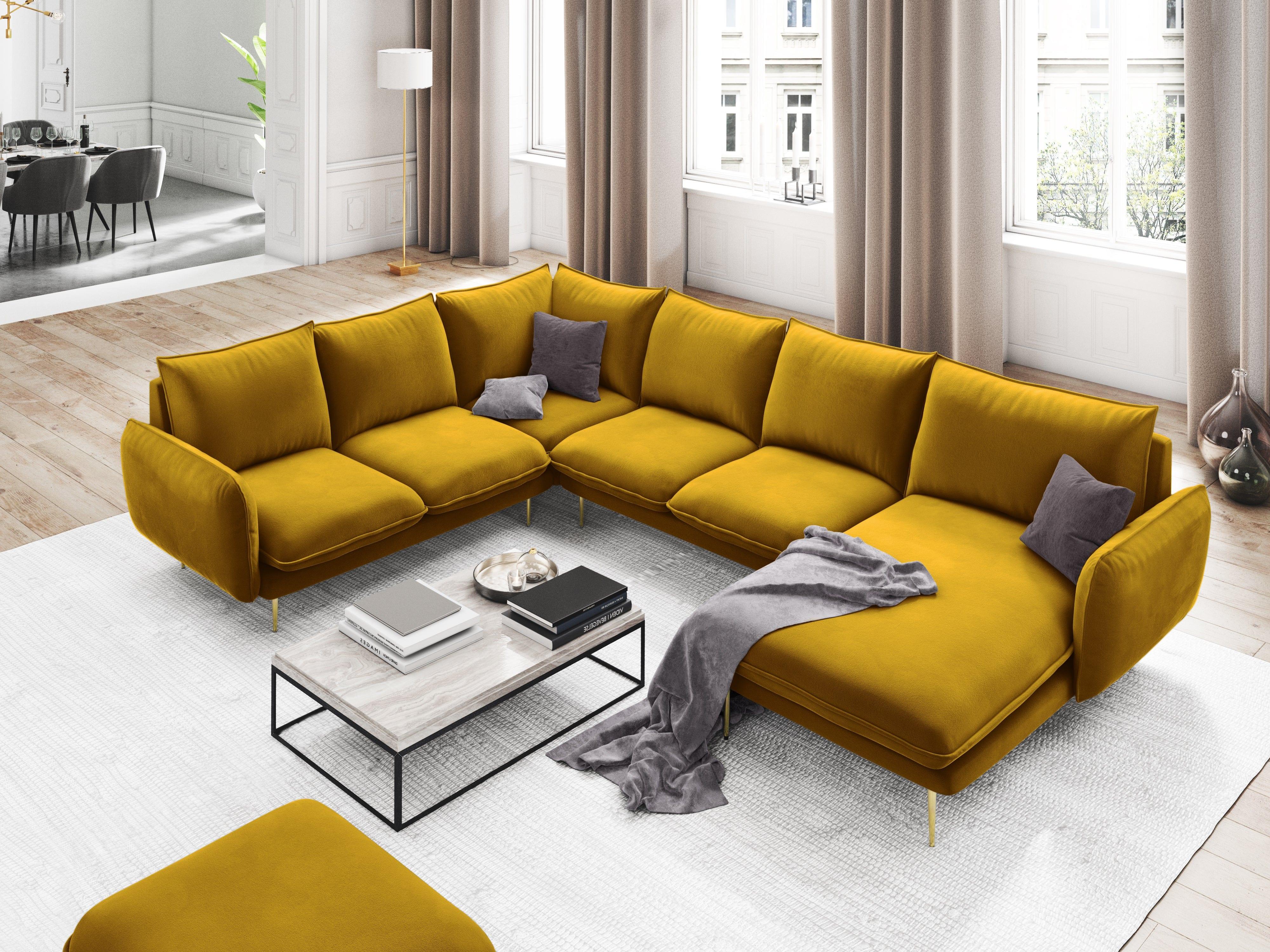 Left -handed corner velvet panoramic Vienna Yellow with a golden base