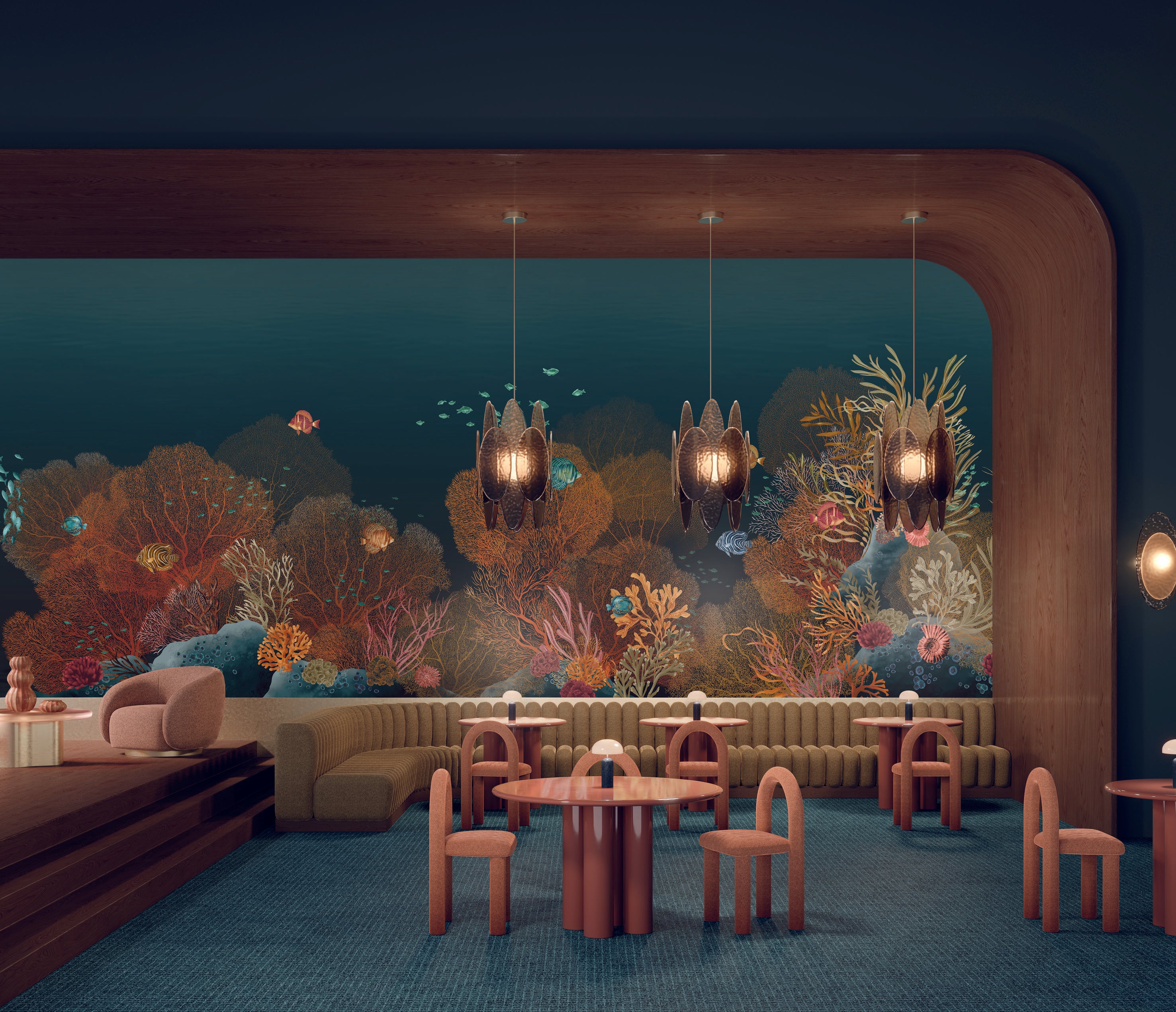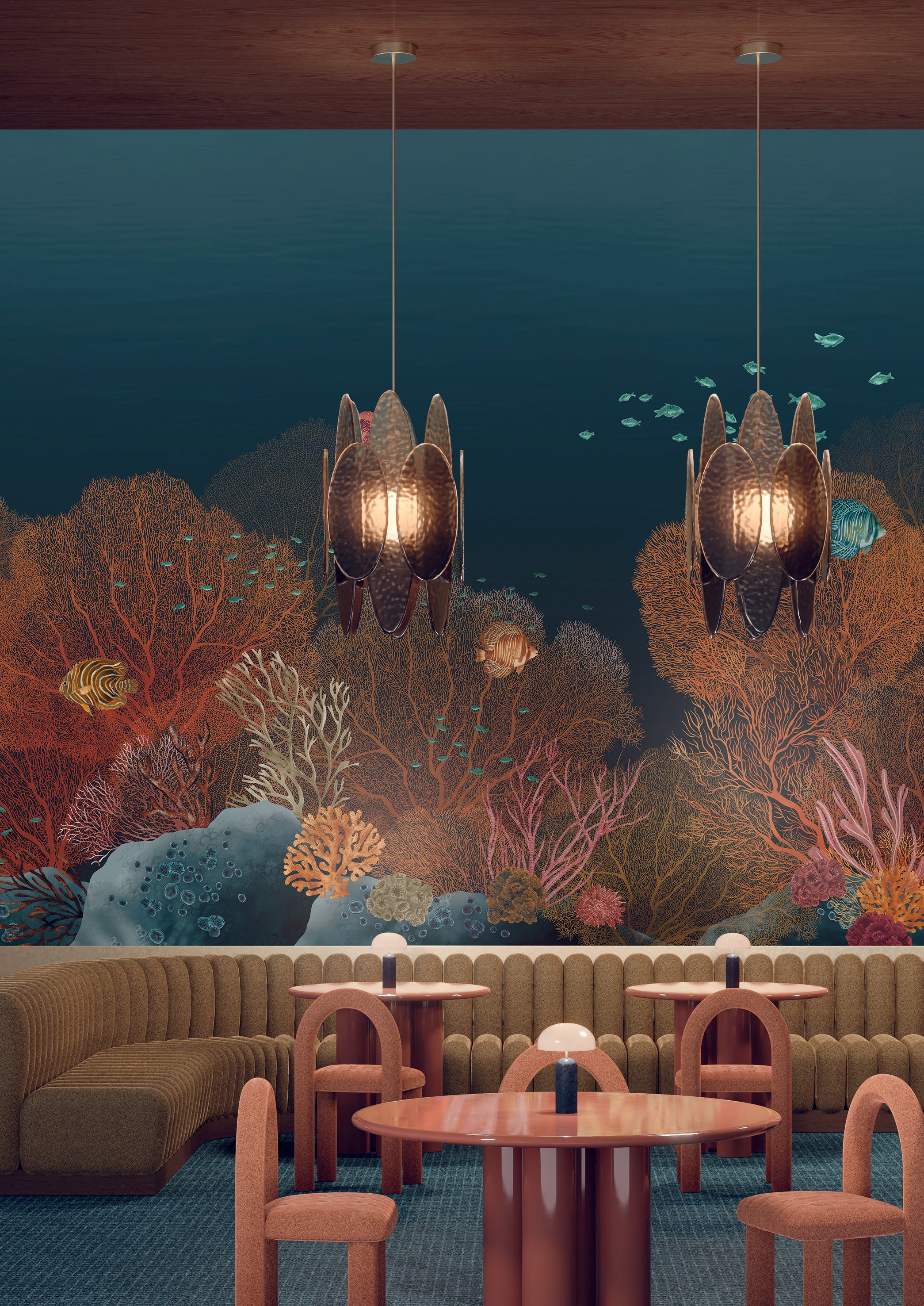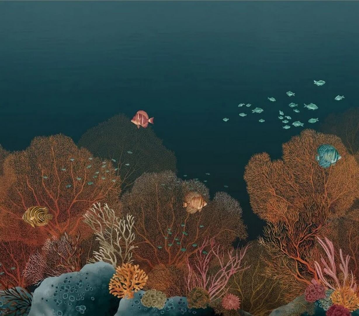 Mural with a marine motif POLYNESIE - MARINE/MULTICO navy blue with brown