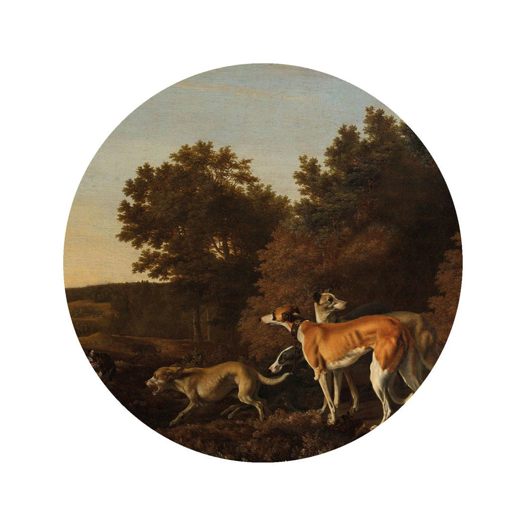 Mural Dots Chart is a wall decoration in the shape of a circle, depicting a classic hunting scene with dogs against a natural landscape. The motif, inspired by traditional painting, brings elegance, nobility, and a timeless character to the interior. The delicate colors and illustrative form give the composition a unique charm, creating a decoration that combines history with artistic aesthetics.