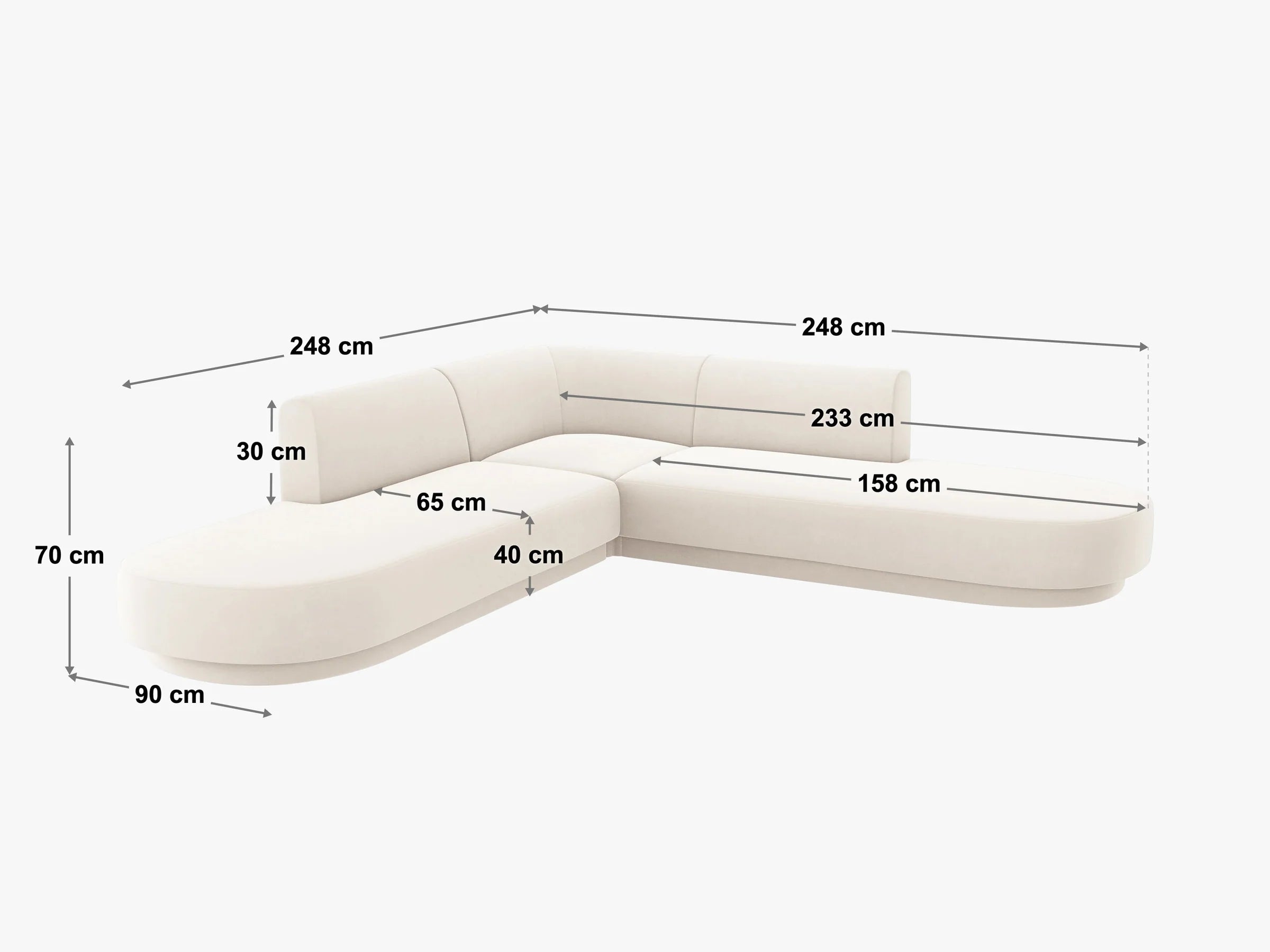Modern corner sofa Miley captivates with its rounded shapes and subtle lines that perfectly align with the latest interior design trends. Its minimalist form combines elegance with comfort, while the enveloping backrest smoothly transitions into the armrests, giving the whole piece a cohesive, harmonious look. The rounded, resilient seats ensure comfort in every position, and the structure set on a light elevation creates the impression of floating above the ground, adding lightness and a modern character.