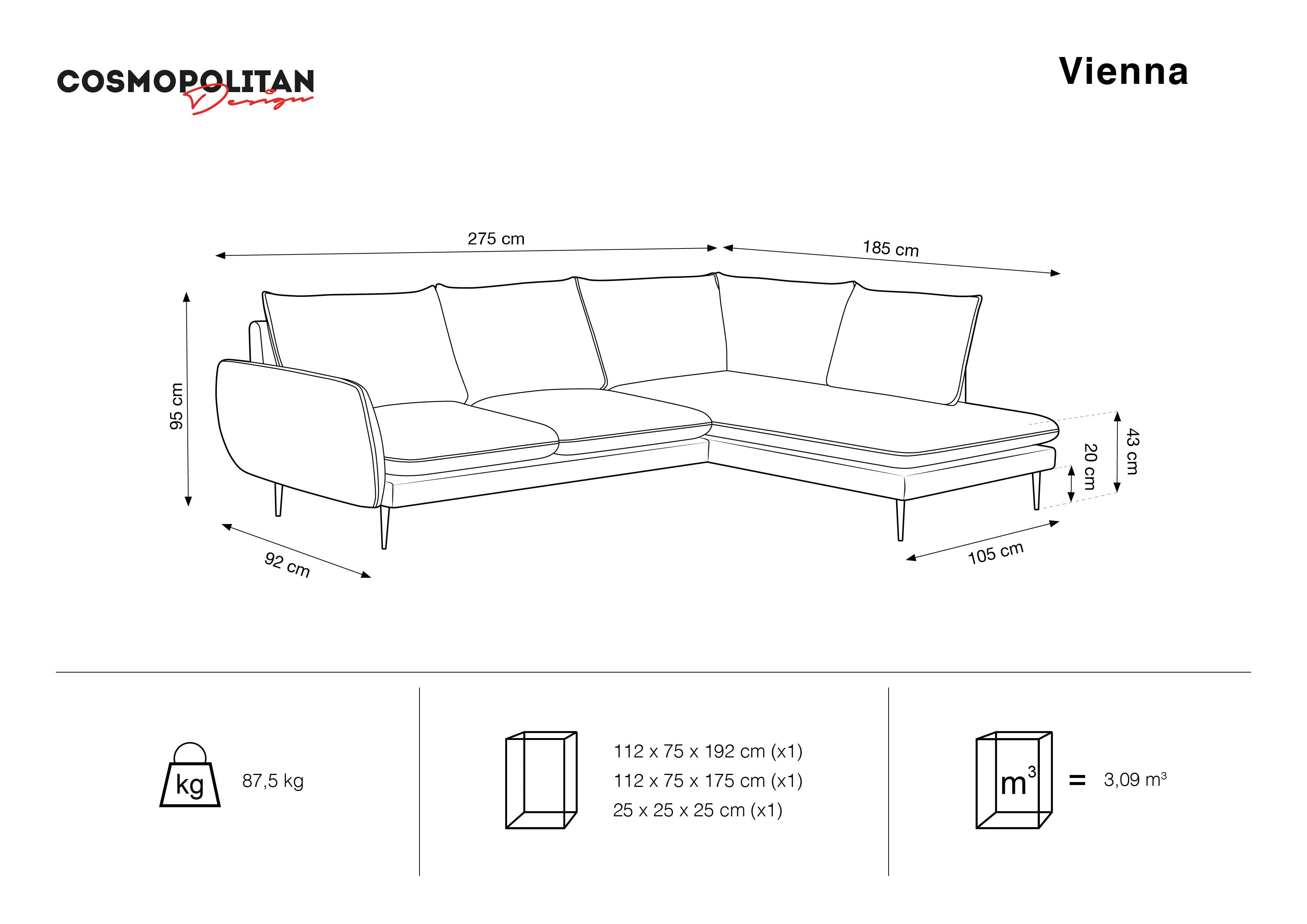 Right-facing 6-seater corner sofa VIENNA beige chenille with gold base