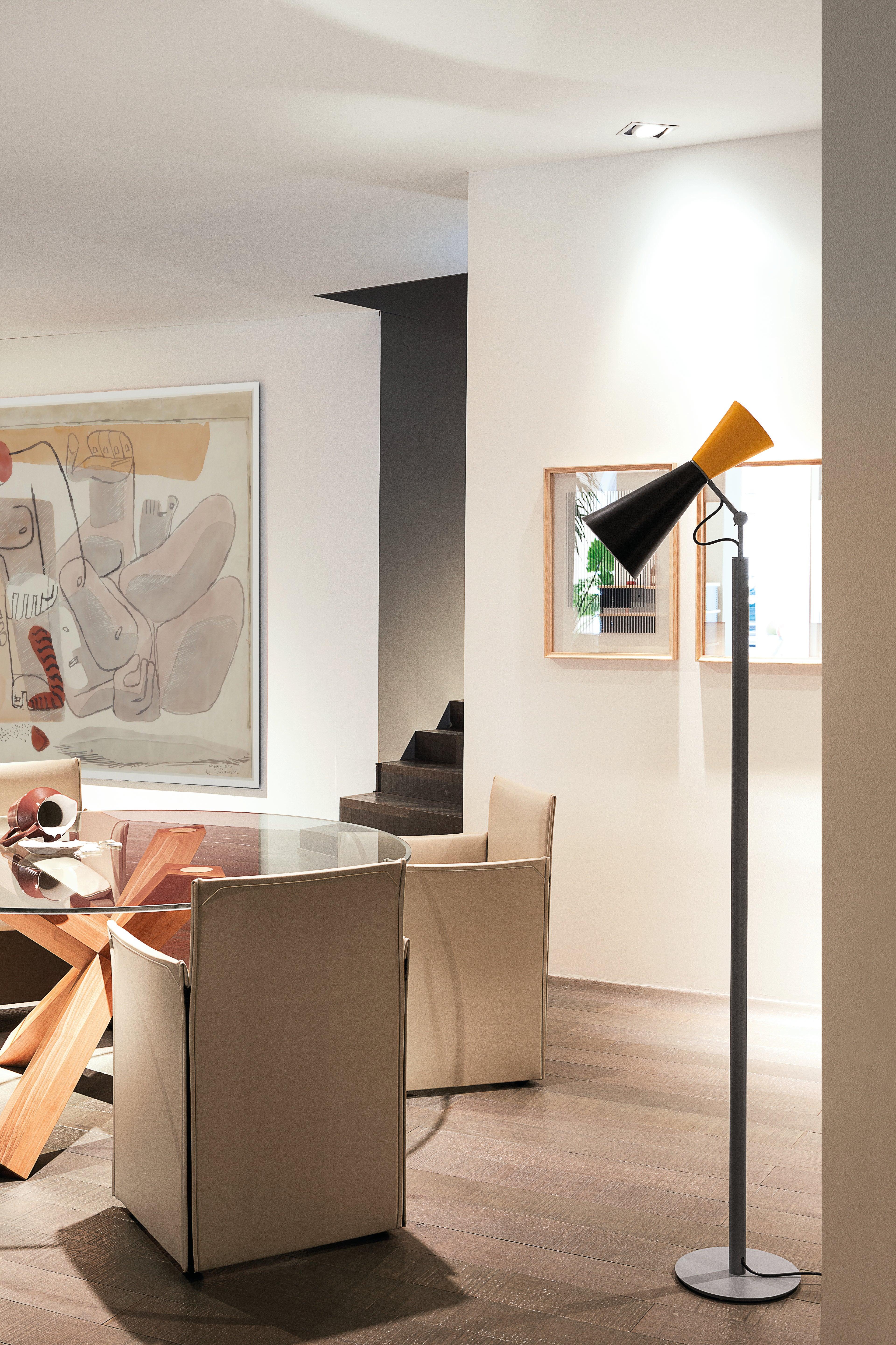 Designed by Le Corbusier in 1963 for the Parliament in Chandigarh, India, floor lamp Parliament is a symbol of modernism of the 1950s, inspired by the then industrial lighting. The adjustable diffuser consists of two open, symmetrical cones that provide direct and indirect lighting. The finishes are reflected in the "Claviers de Couleurs" color system developed by the Swiss-French master.