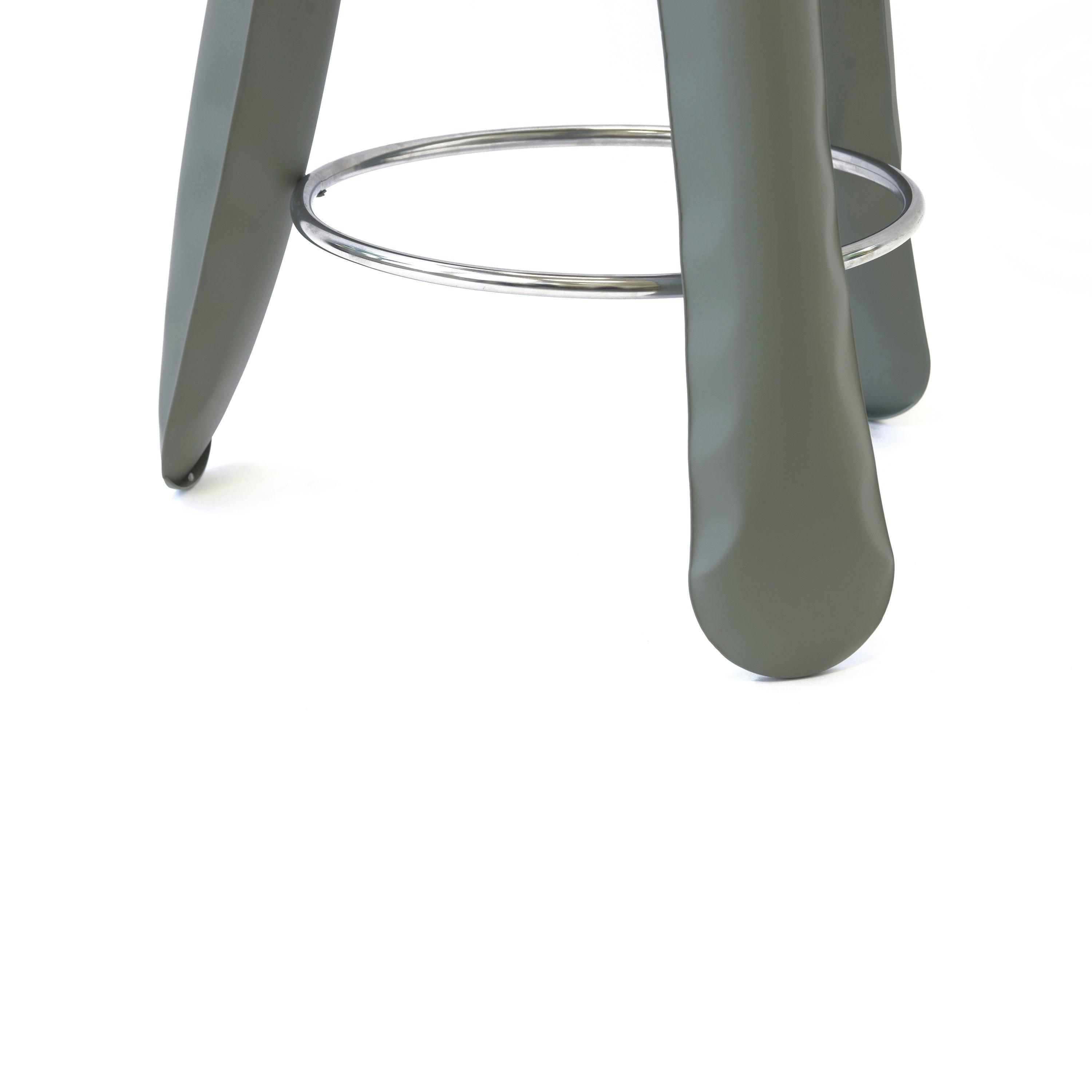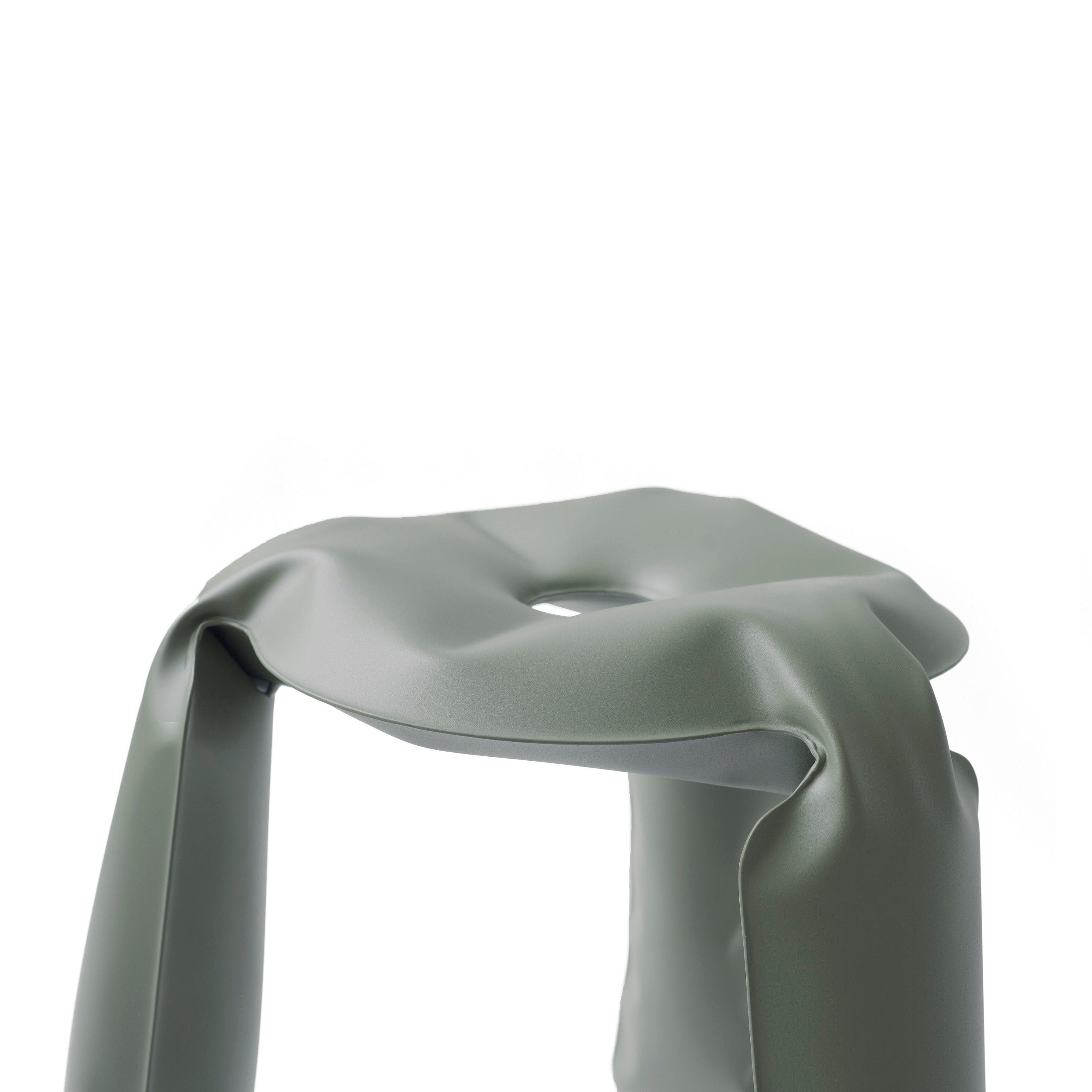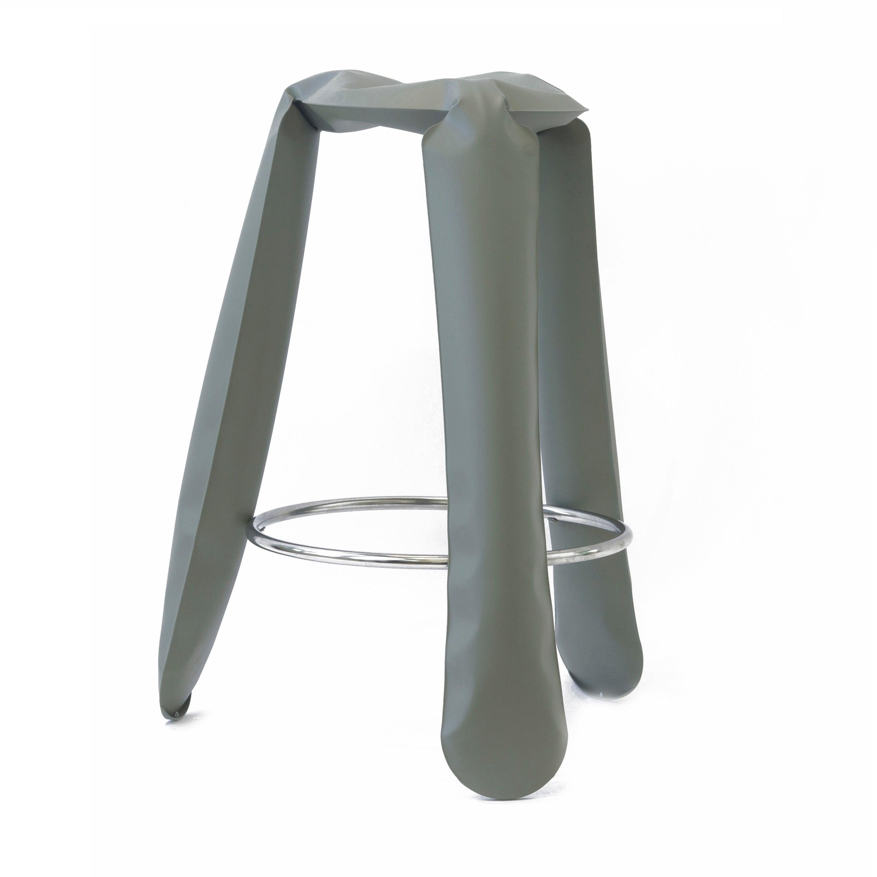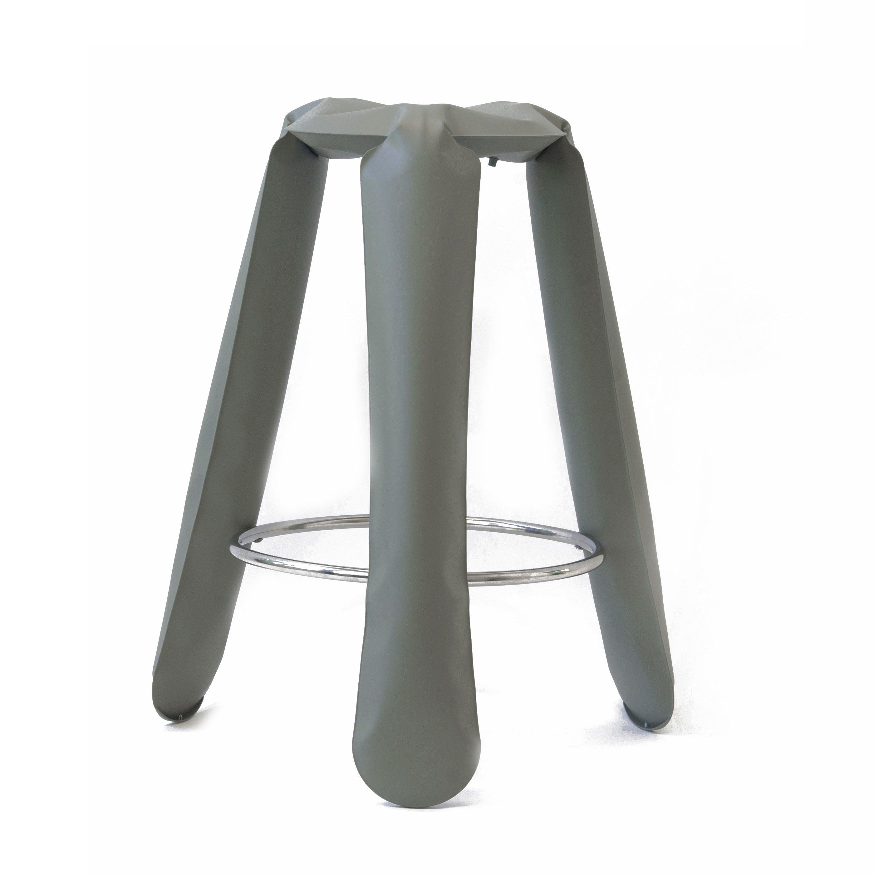 Plopp bar stool In gray-green is a real showcase of Zaeta Studio and at the same time a symbol of Oskar Zięt's research on the properties and possibilities of metal. This unusual stool, also known as "Polish people pumped with air", is a great example of how artistic aspects of design can be revealed through highly advanced engineering forms.