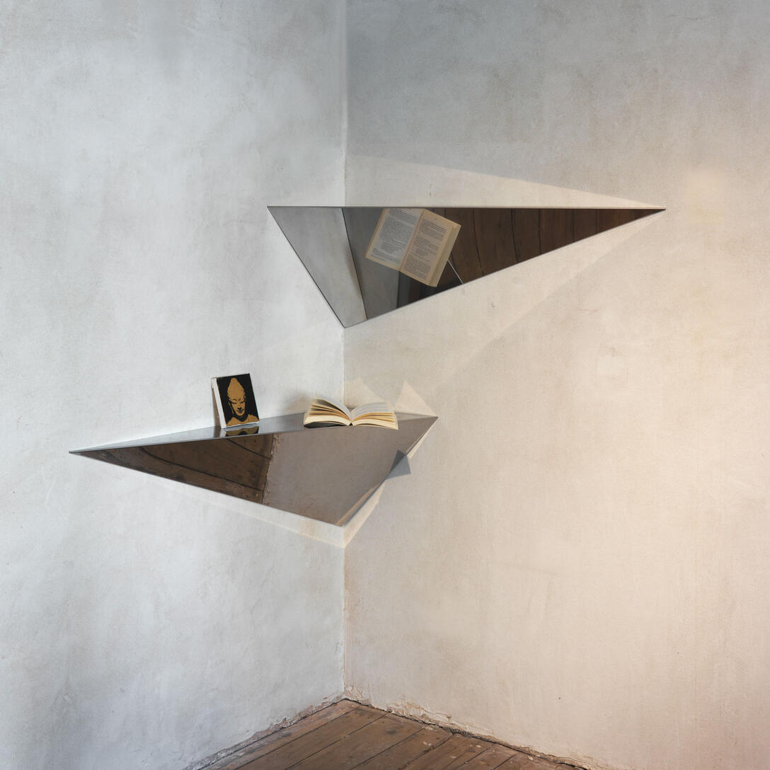 Wall shelf Henri is a unique example of modern design with a touch of avant-garde. Designed by Bruno Rainaldi, it stands out with its unusual triangular shape, which easily adapts to challenging spaces — corners, recesses, as well as walls in the bathroom, hallway, living room, or bedroom. Its minimalist form and polished stainless steel finish add elegance to interiors and harmonize beautifully with both modern and classic decor.