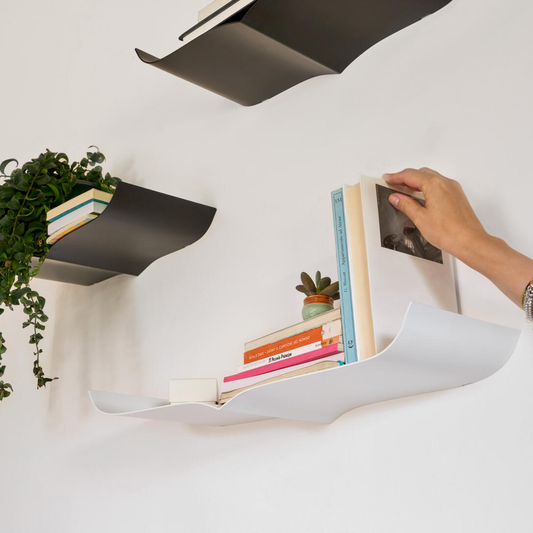 The minimalist form makes the shelf perfect for the living room, bedroom, kitchen, bathroom, and even in office spaces. Available in two sizes and colors – white and black – it allows for the creation of dynamic compositions reminiscent of a flock of seagulls. This is not only a practical storage solution but also a decoration with an artistic character.