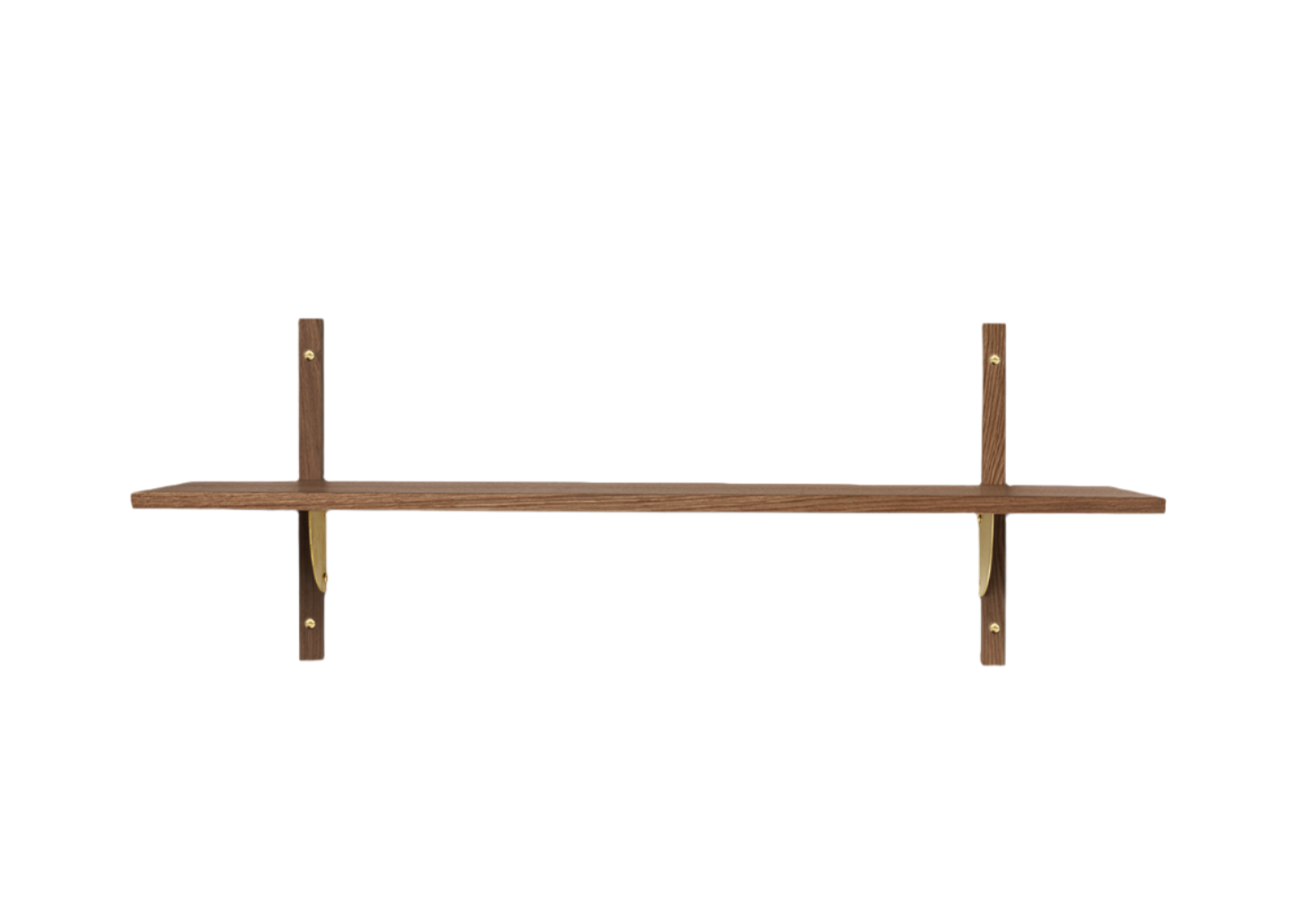 Sector Wide Shelf is a contemporary interpretation of classic mid-century bookcases, combining simplicity of form with timeless elegance. Made from veneer and solid oak wood in a smoked oak finish, and accented with brass brackets, it brings a refined character to the interior. The visible mounting elements add an authentic, architectural expression.