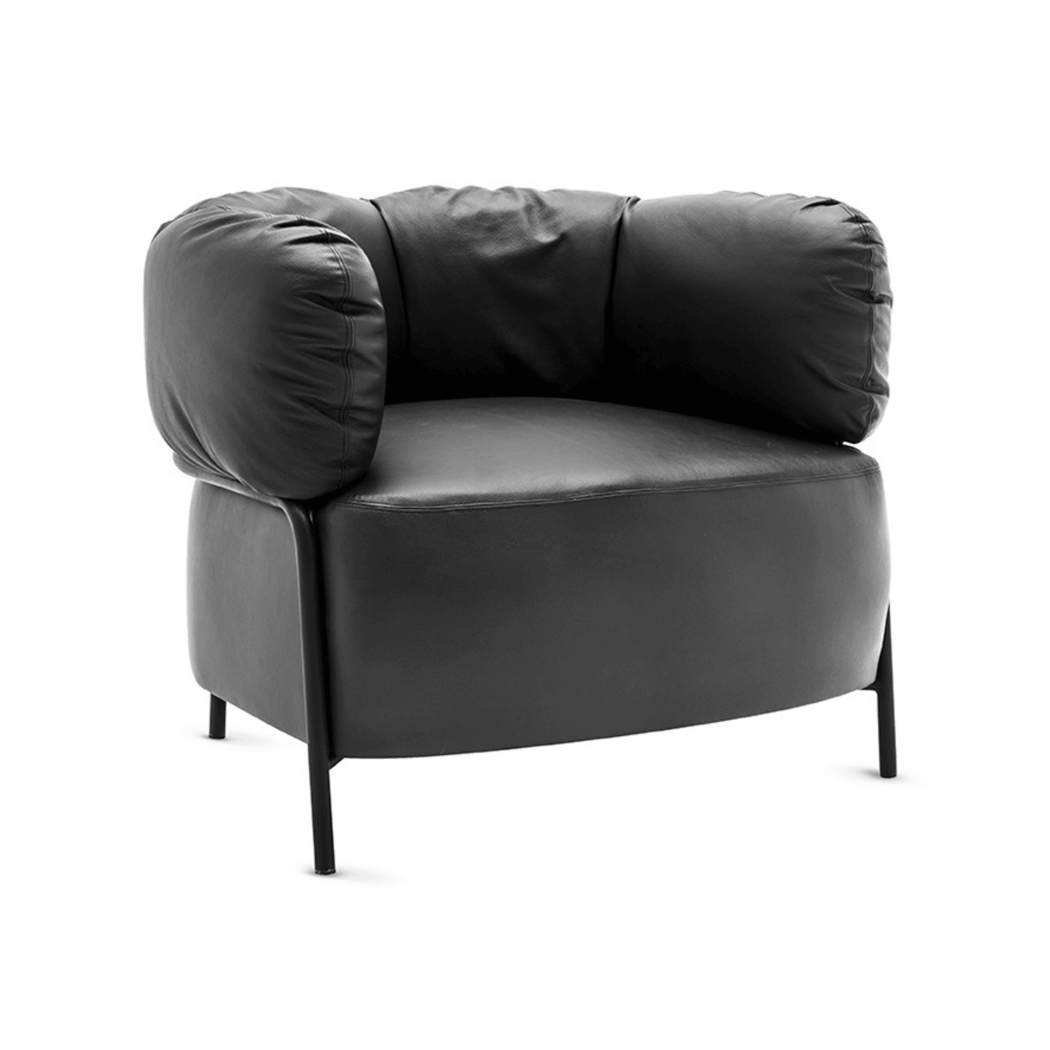 Armchair Quadrotta, supported on a metal frame available in three different finishes, has a soft and surrounding support in combination with a comfortable seat with internal flexible stripes, ensuring both comfort and durability. It can be upholstered with leather or fabric.