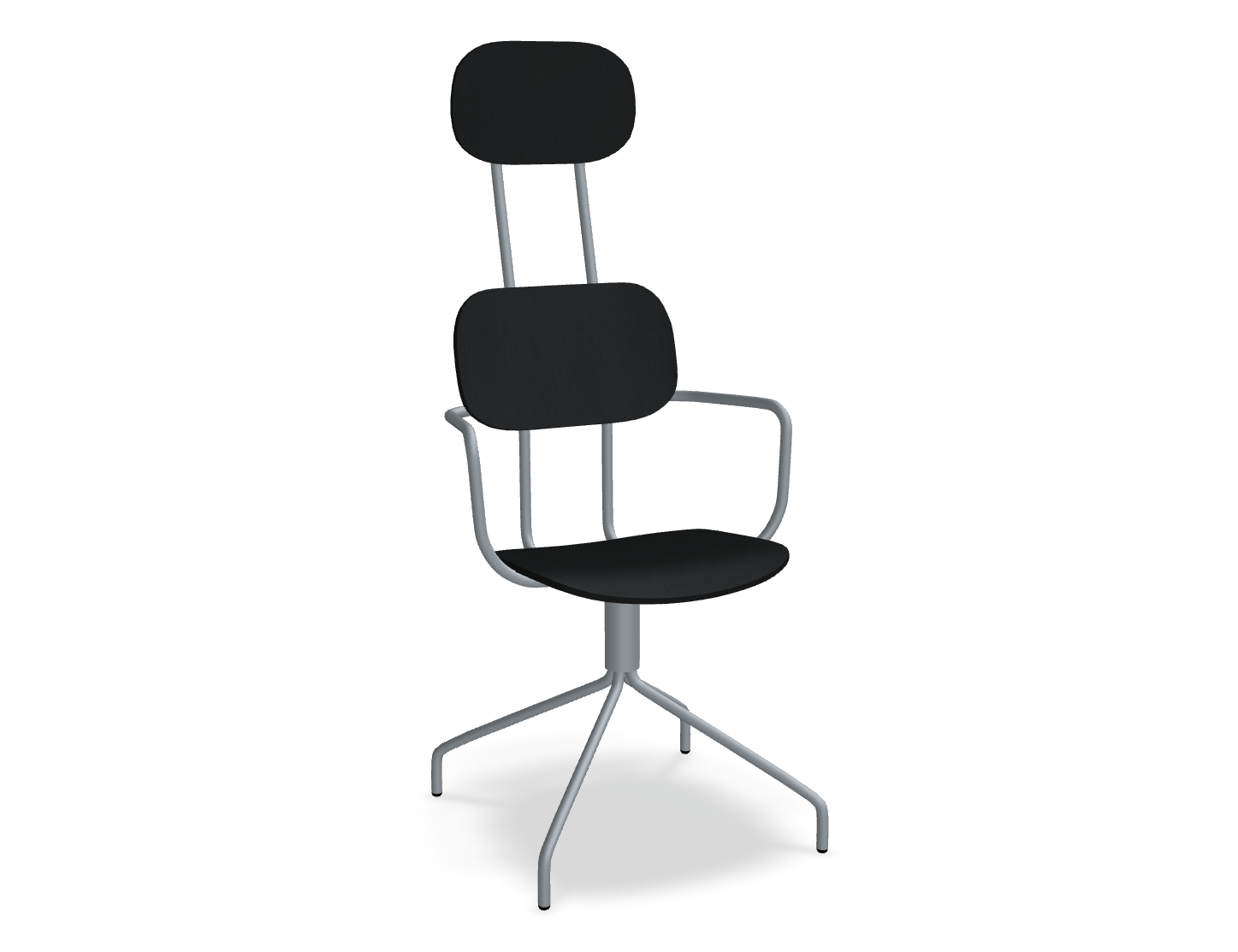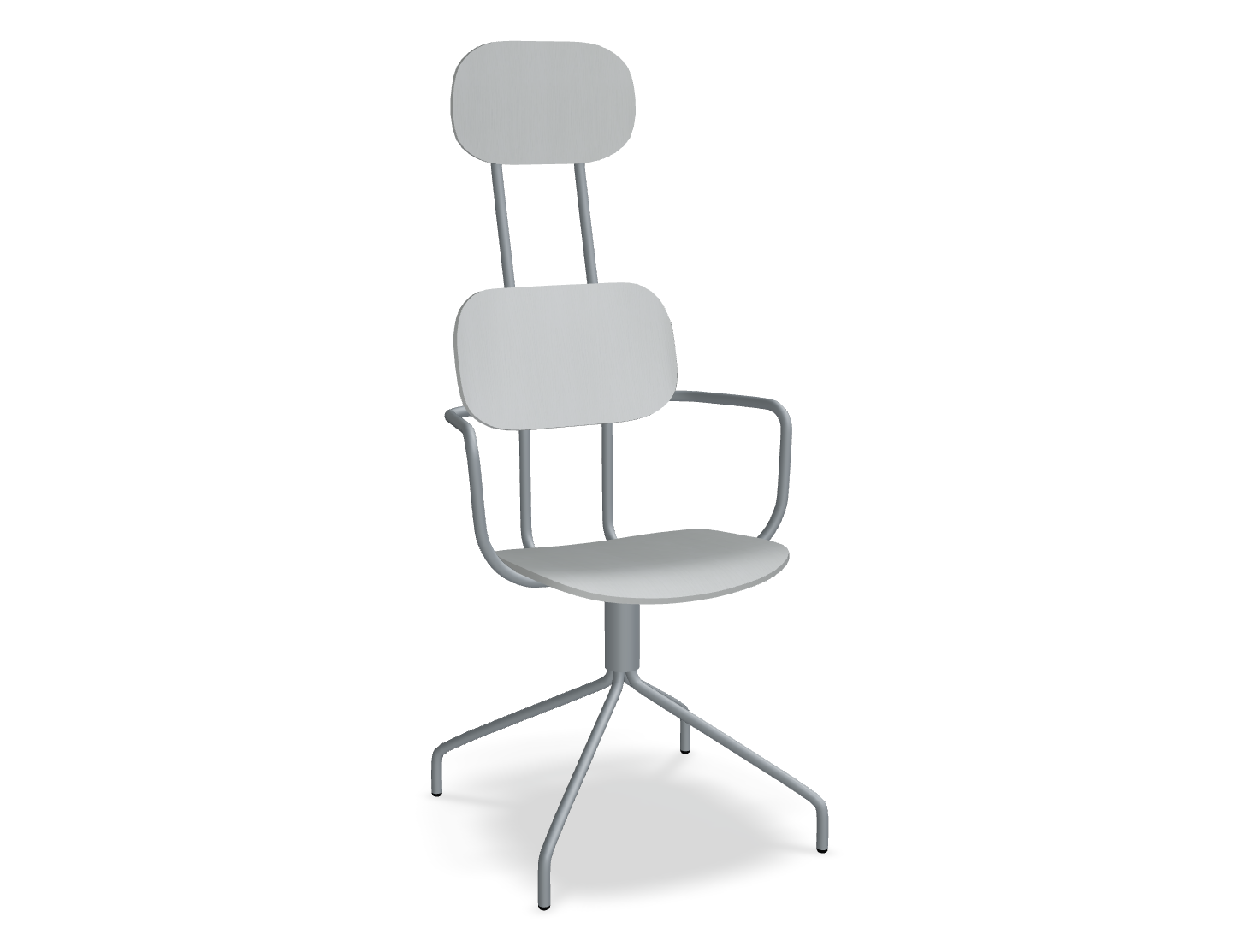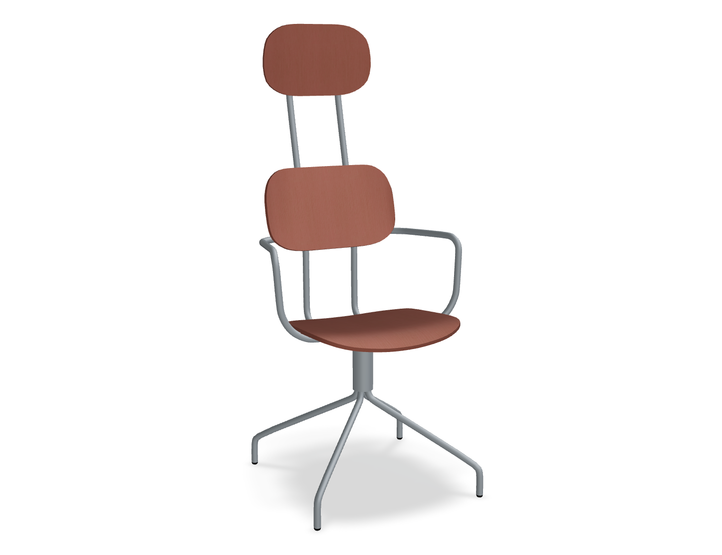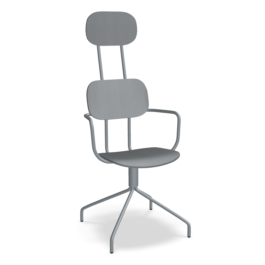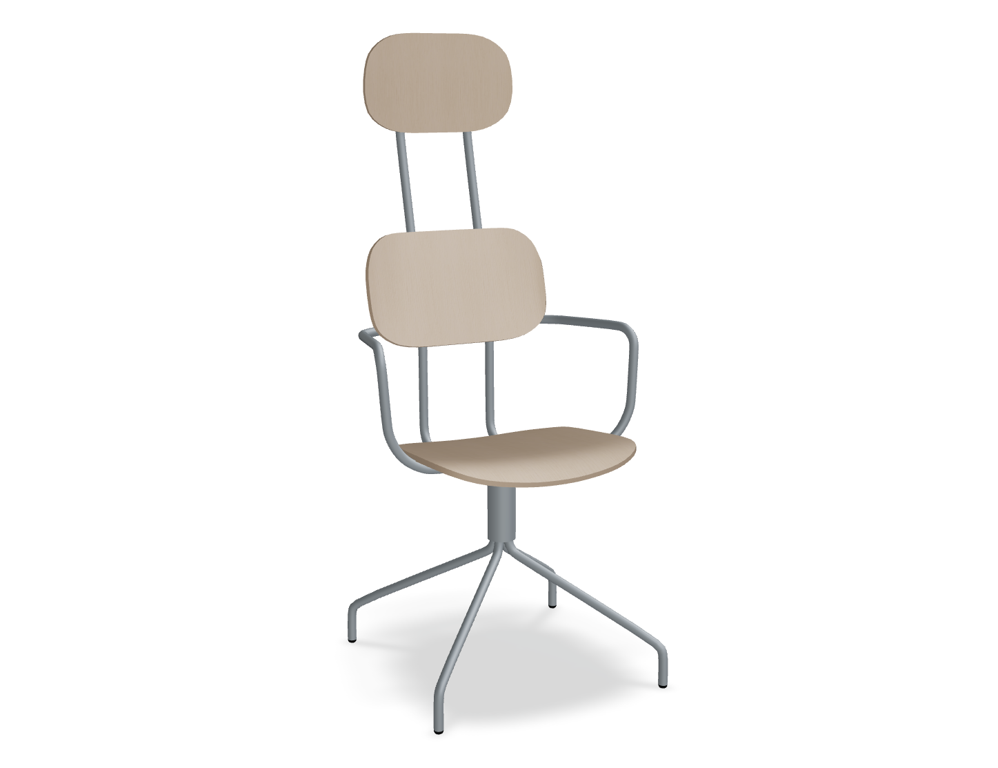 Swivel chair The new school with a headrest, designed by Studio Form US with Love, attracts attention with a modern form with double support. This backrest not only emphasizes modern design, but also provides excellent support for the whole back. The rotating base guarantees freedom of movement, and optional armrests further increase the comfort of use. The plywood version is distinguished by durability and ease of care, which makes it an ideal choice to the space used by many people.