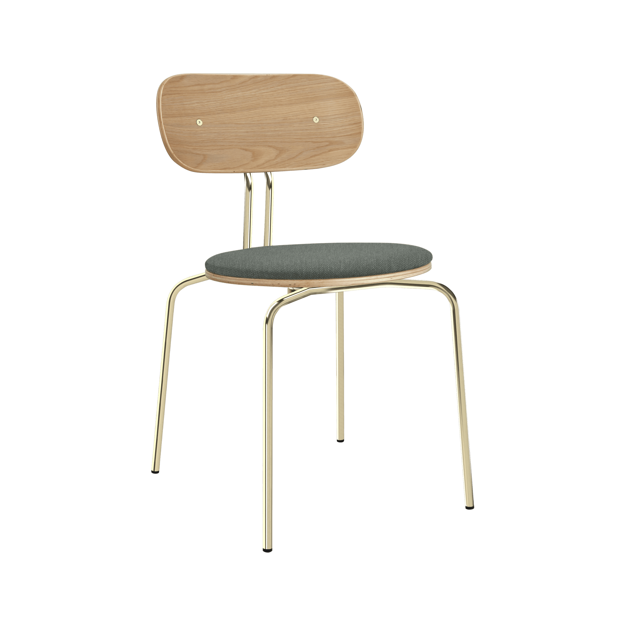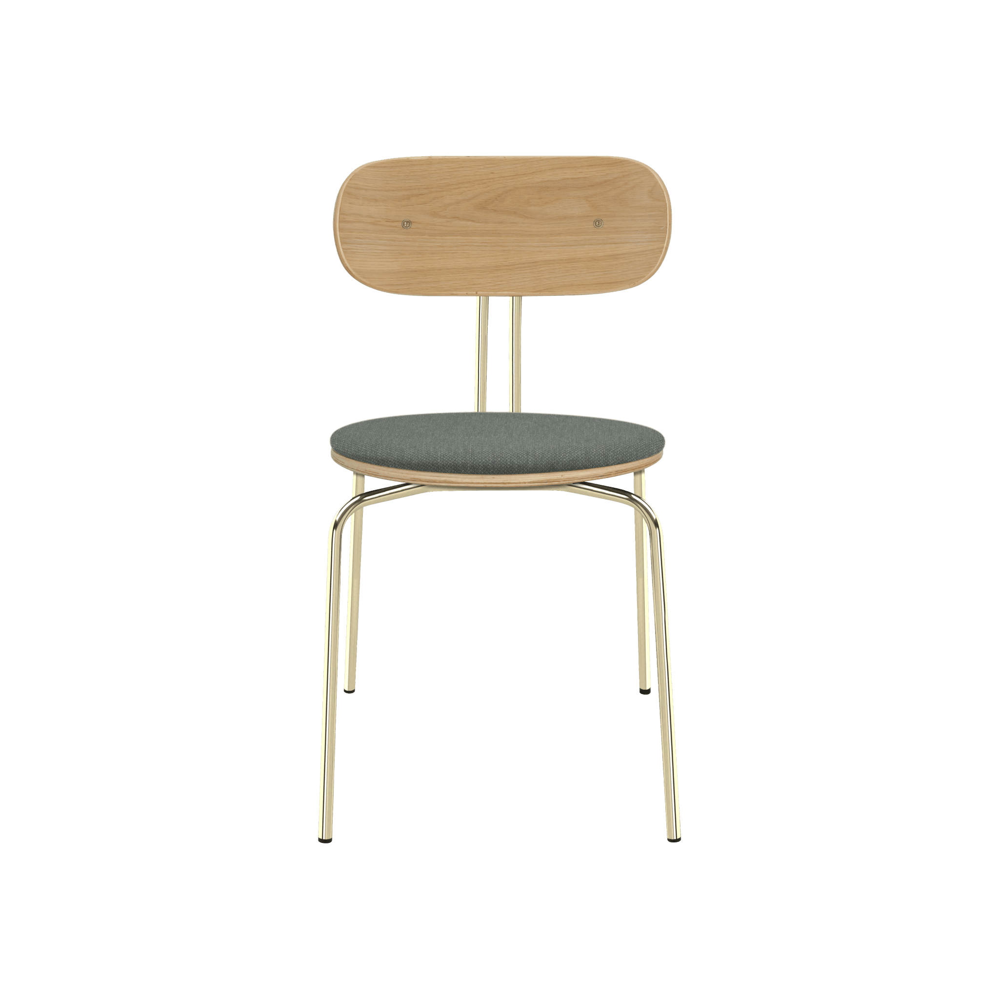 Chair Curious is elegant, light and minimalist furniture, made of oak veneer. It is available with brass or black legs, and the optional seat cushion provides additional comfort. You can choose a pillow from 17 colors of Horizons fabric, made 100% recycled, as well as in a brown or white shade of Teddy Bear fabric.
