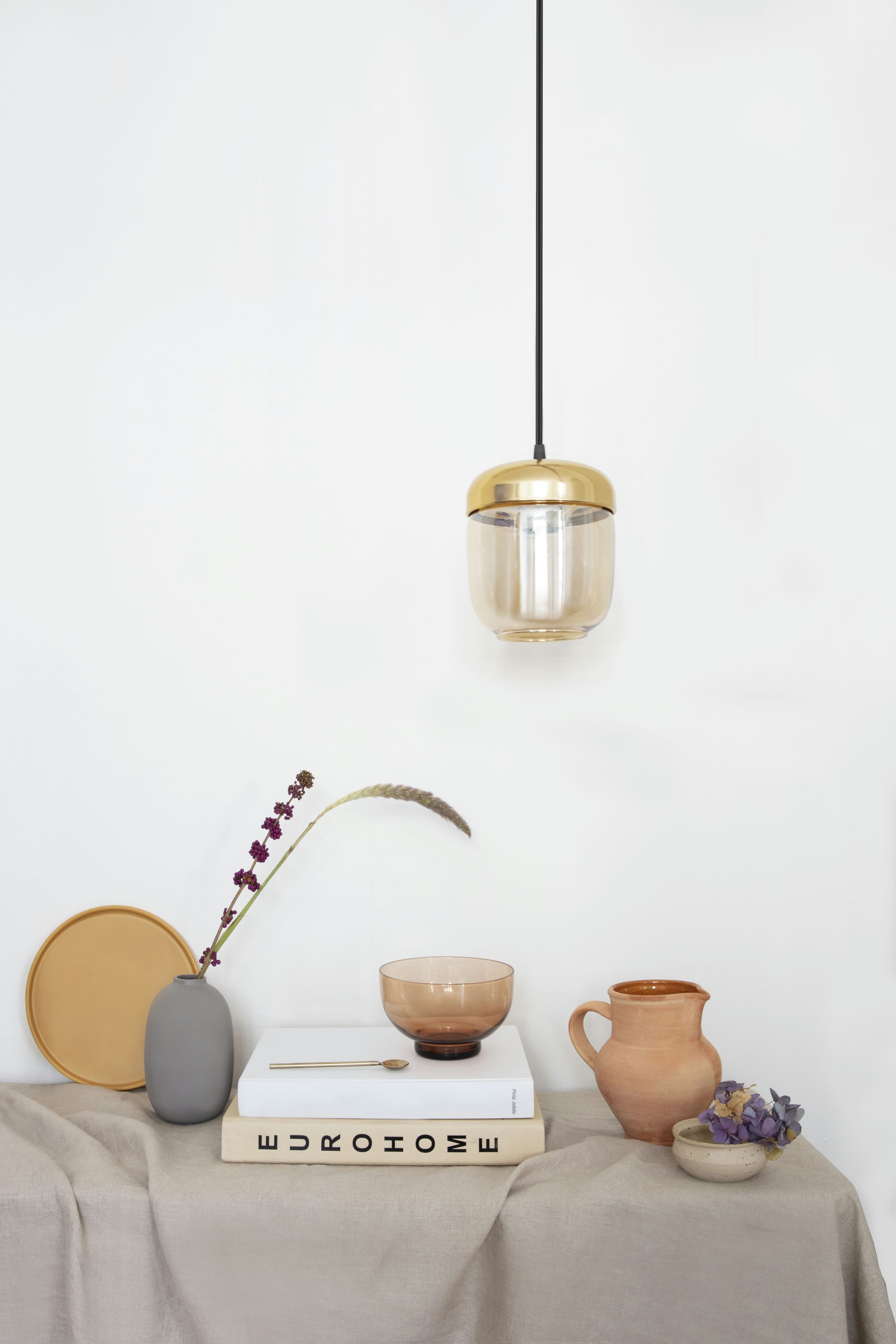 Shade Acorn in golden color with smoked glass is a tribute to small, delicate acorns that fall under the roots of powerful oaks. His simple, picturesque design will take you to the magical forest with your thoughts. Subtle nut, Acorn consists of three elements: a soft silicone bowl, a smooth outer glass shell and a characteristic, metallic testicle, creating a delicate symphony. Although the acorn can be small, there is a clear world!