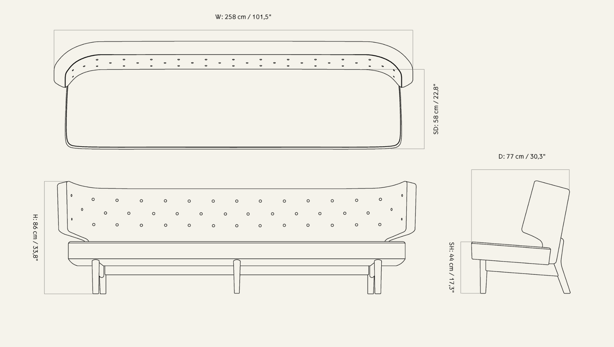 Zamiast ówczesnych, konserwatywnych form, Lauritzen zaprojektował sofę o płynnej, futurystycznej linii. Jej zaokrąglone kształty, otwarta konstrukcja i pikowane oparcie tworzą wrażenie lekkości, jednocześnie oferując wyjątkowy komfort. Dzięki dopracowanym detalom i pięknu widocznemu z każdej strony, Radiohus Sofa najlepiej prezentuje się ustawiona swobodnie w przestrzeni.