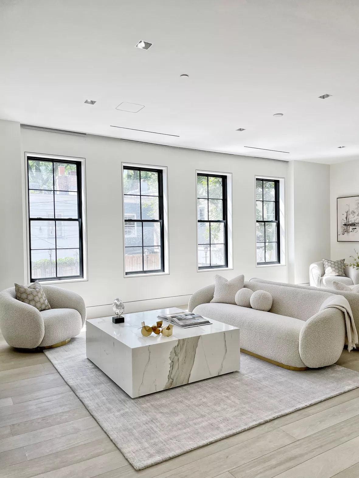 Creamy sofa Brice is made of sophisticated cream fabric Bouclé, which gives it a unique character. This soft and delicate fabric provides a pleasant experience during relaxation, and at the same time gives the sofa a unique, luxurious look. The base of the sofa is made of brushed brass, which adds elegance and solidity.