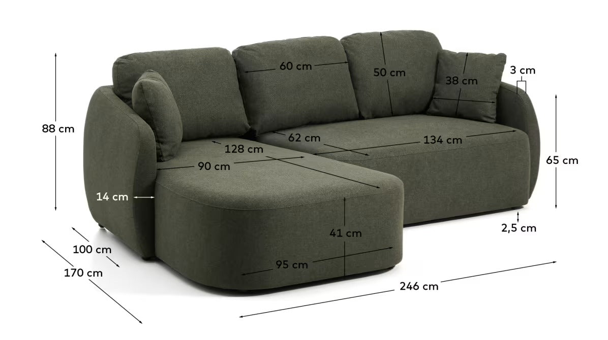 The filling made of medium-density foam 28 kg/m³ and backrest cushions with removable covers guarantee balanced softness and optimal support. The construction made of solid pine wood with FSC™ 100% certification and FSC Mix Credit plywood ensures that the upholstered corner sofa is stable, durable, and produced with respect for the environment. It is a comfortable and aesthetic choice for the living room that combines design, functionality, and quality materials.