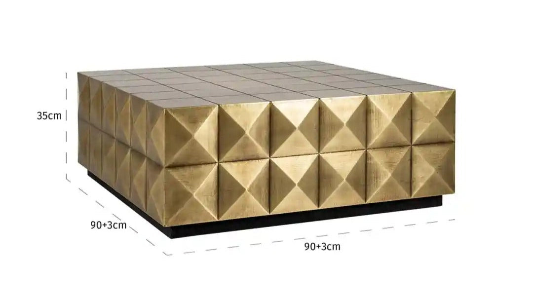 Exclusive coffee table Collada with a geometric shape is a unique piece of furniture that catches the eye at first glance. Its front and sides are adorned with a striking texture in a golden shade of brass, giving the whole a luxurious character. The construction based on solid MDF with the addition of glass makes the table combine elegance with functionality, becoming a decoration for any living room.