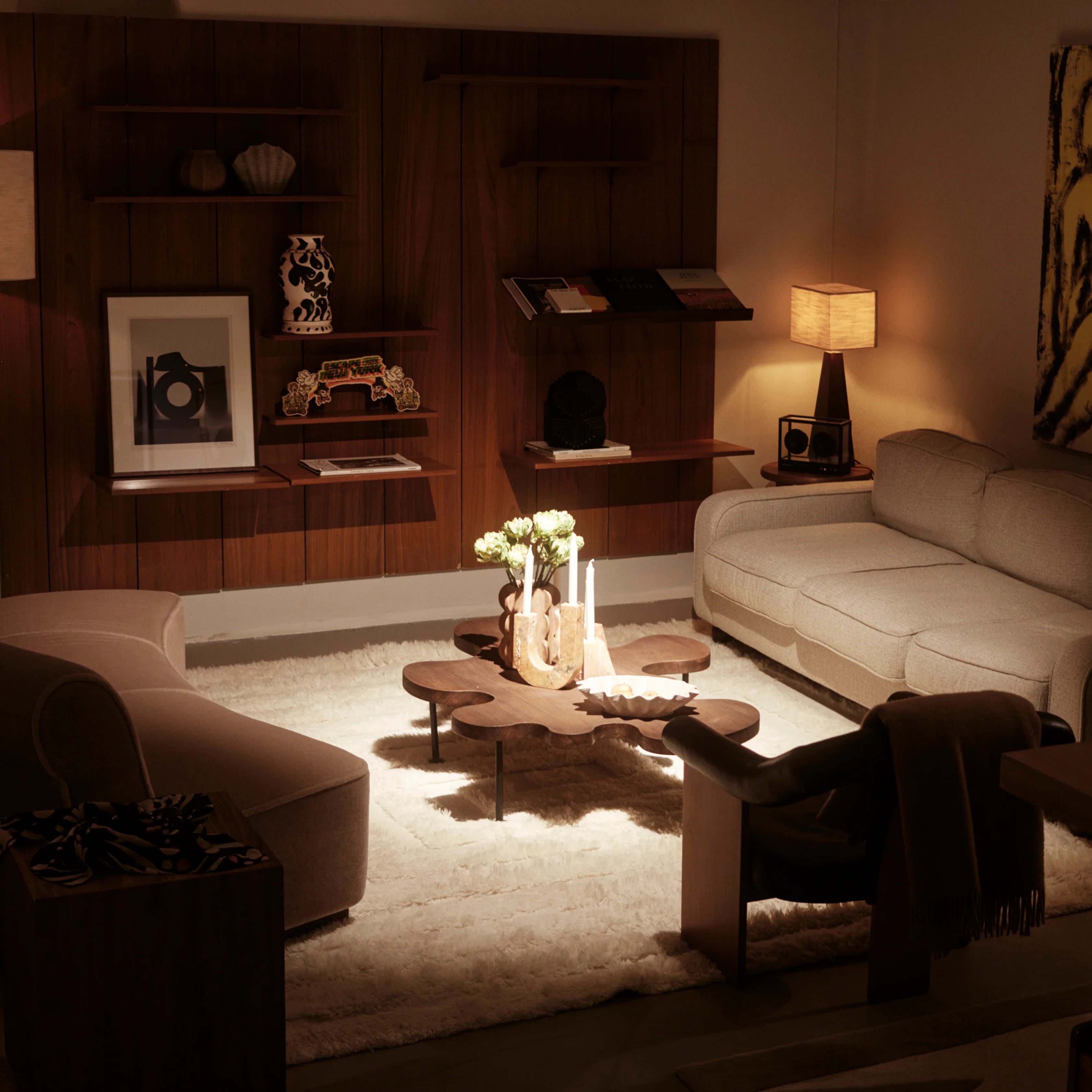 The table rests on slender legs made of black lacquered steel, which contrast with the wooden top and give the whole a sense of lightness. Devon is perfect as a central element in the living room, introducing both elegance and a subtle artistic touch to the space.