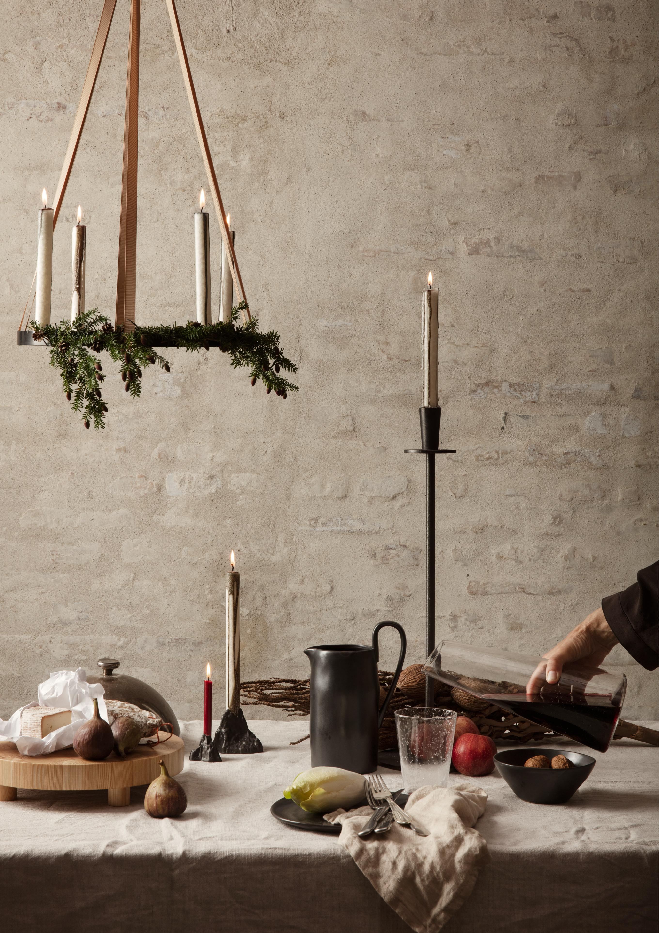 This multifunctional and minimalist candle holder is an elegant addition that delights with its simplicity and craftsmanship from natural materials. Made of solid brass with a black patina, it can be placed directly on the table or hung using the included removable leather straps. This timeless piece will accompany you not only in December but throughout the entire year.