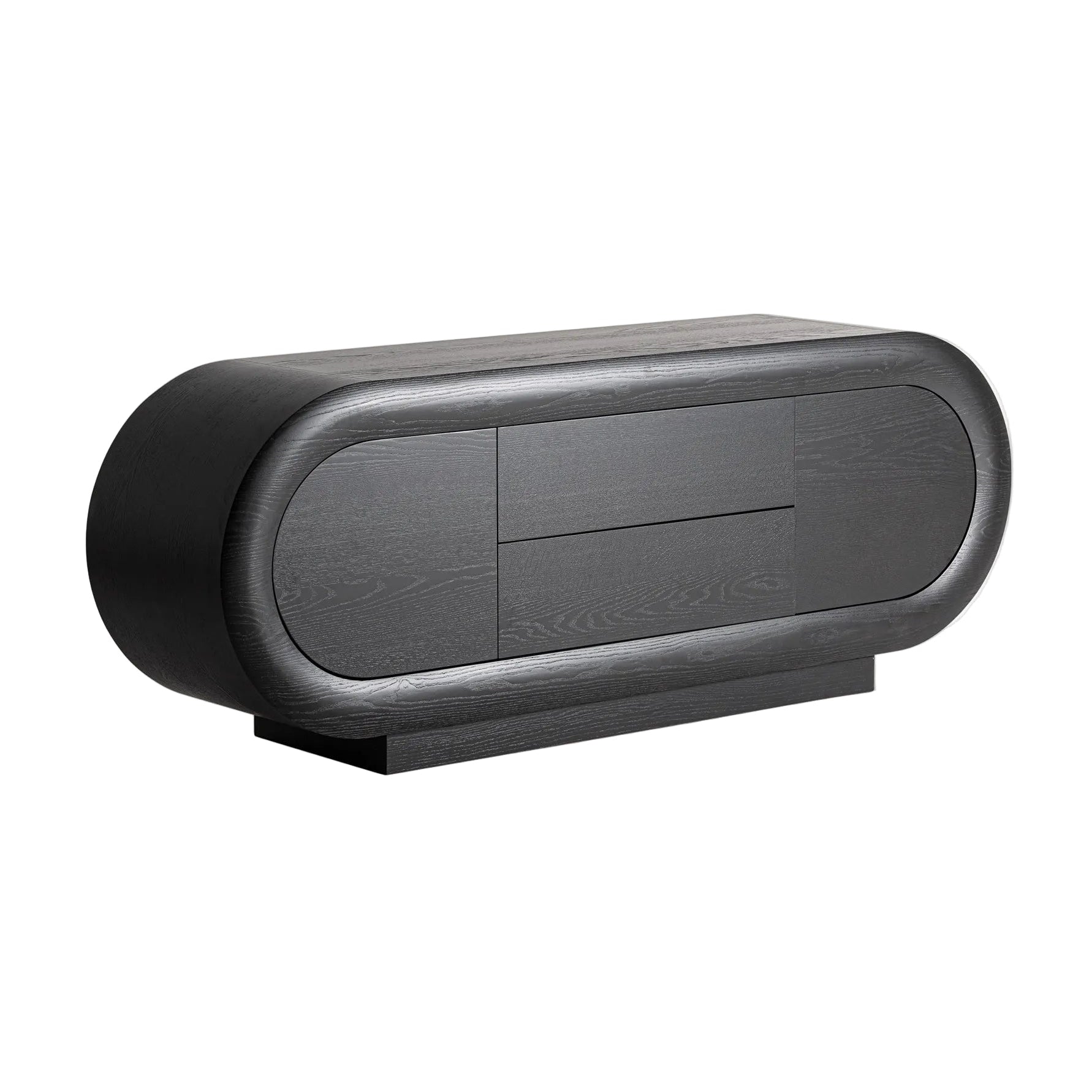 TV Cabinet Chamonix is a modern and elegant piece of furniture that combines a minimalist form with a striking character. Made from oak wood in a deep black finish, it features a harmonious blend of rounded and horizontal lines that give it lightness and visual coherence. This stylish TV cabinet for the living room serves perfectly as a central element in the relaxation area, offering space for multimedia equipment and accessories.