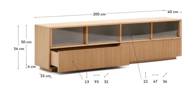 TV cabinet Helvine combines timeless design with inspiration from the simplicity of nature. The combination of oak veneer and tempered glass creates an elegant and visually light piece of furniture that perfectly complements both modern and classic arrangements. The glass brings in light, allowing the colors and textures of the interior to define its character, while the wood adds a cozy, natural accent.