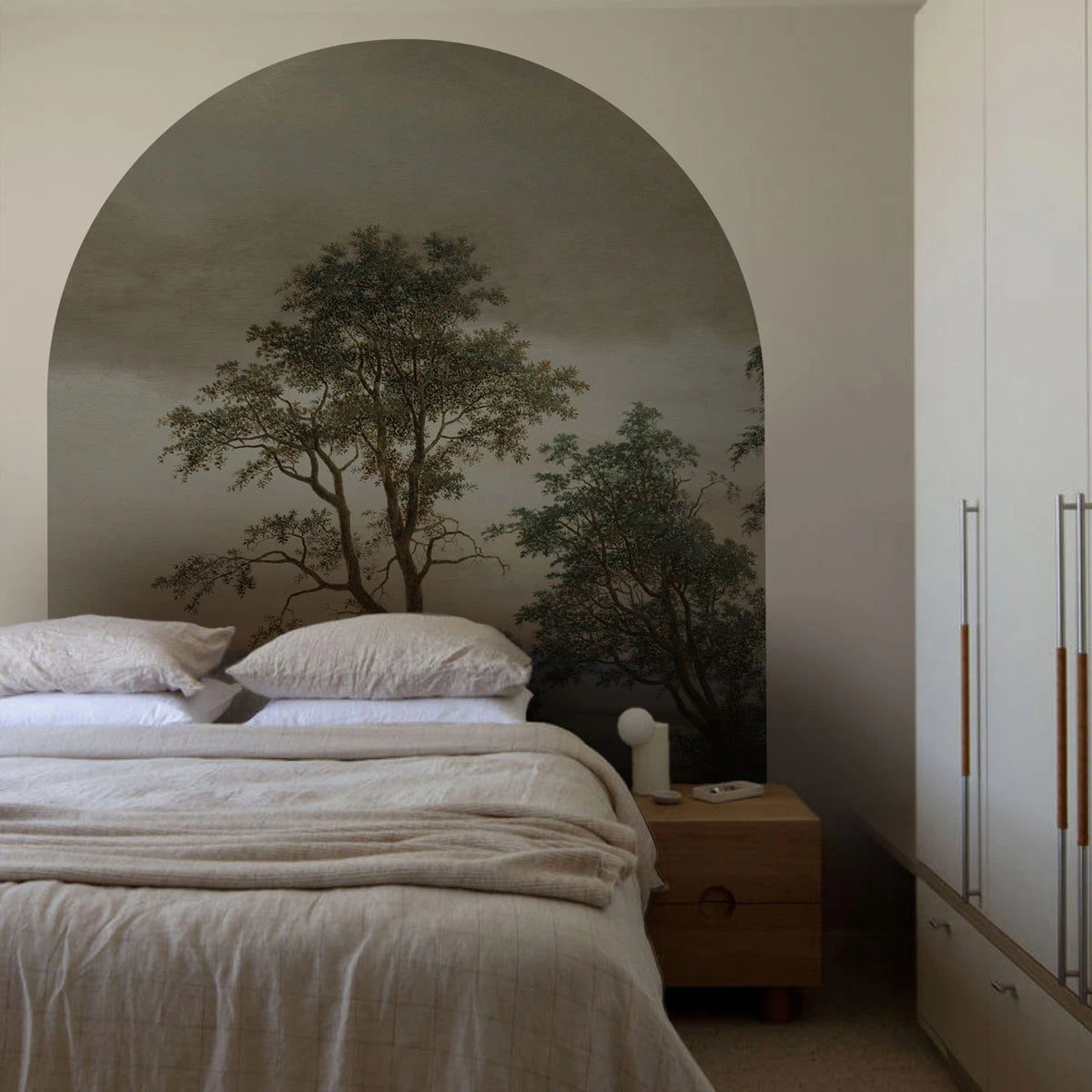 Non-woven mural in the shape of an arch EVENING GROVE brown with green
