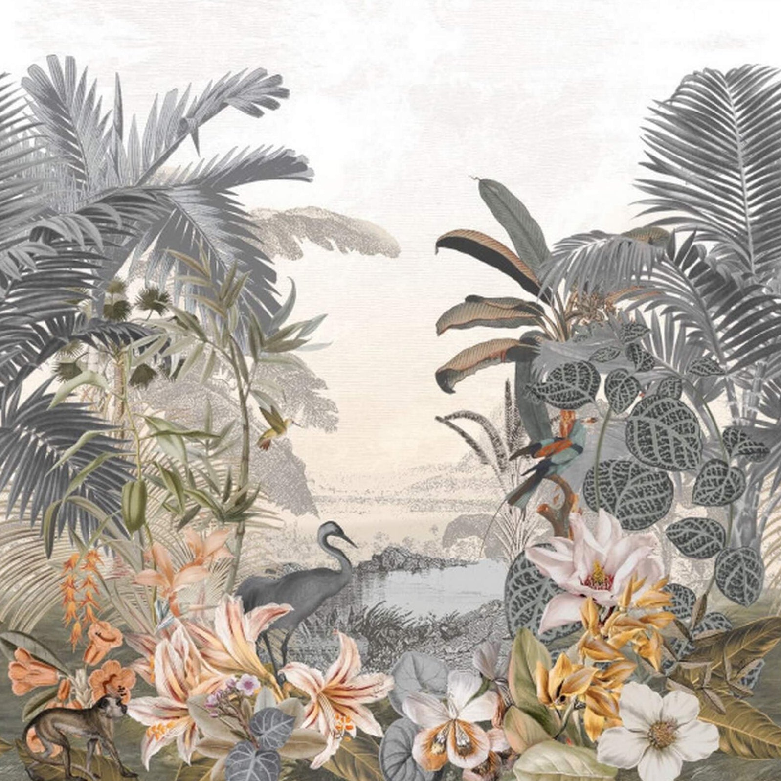 Textile mural with exotic landscape PARAIBA muted blue with beige
