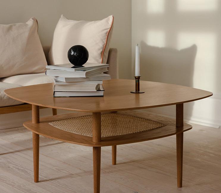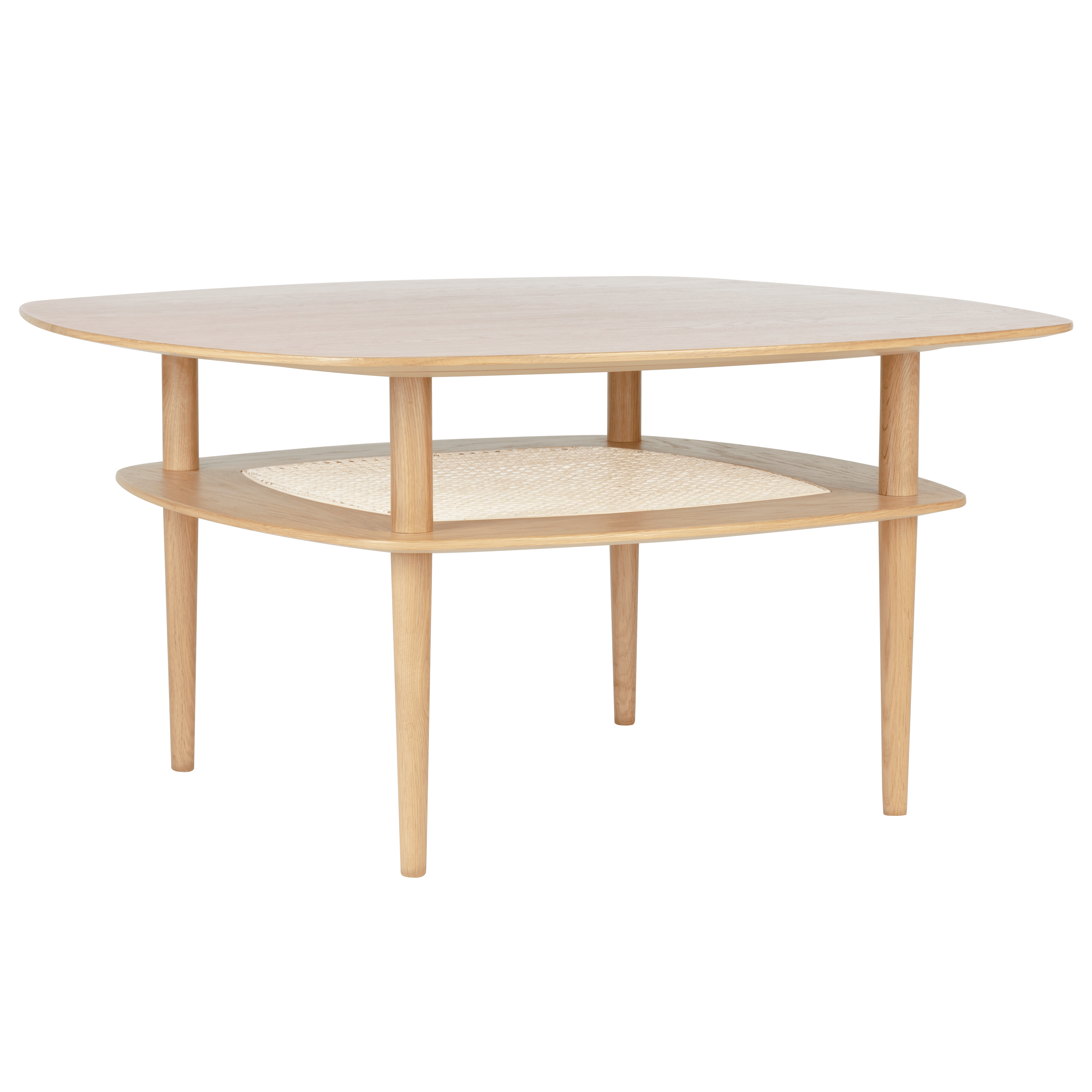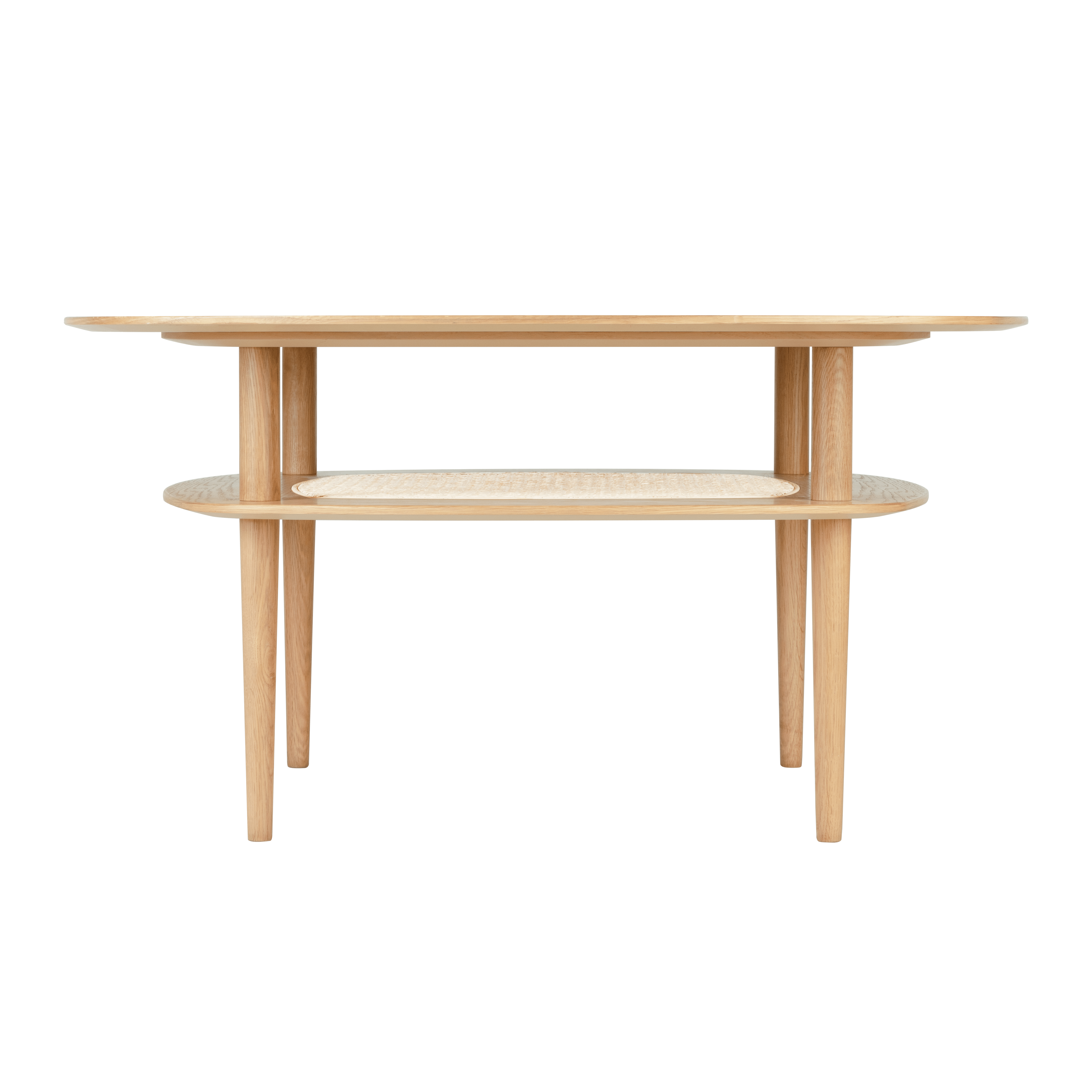 Coffee table Together was made of solid oak wood, varied with a shelf made of Venetian reed, which gives the project lightness. Rounded table corners give it elegance and make him look spacious. The table legs were intentionally withdrawn from the edge of the countertop, with a view to the safety of children and to protect the fingers.