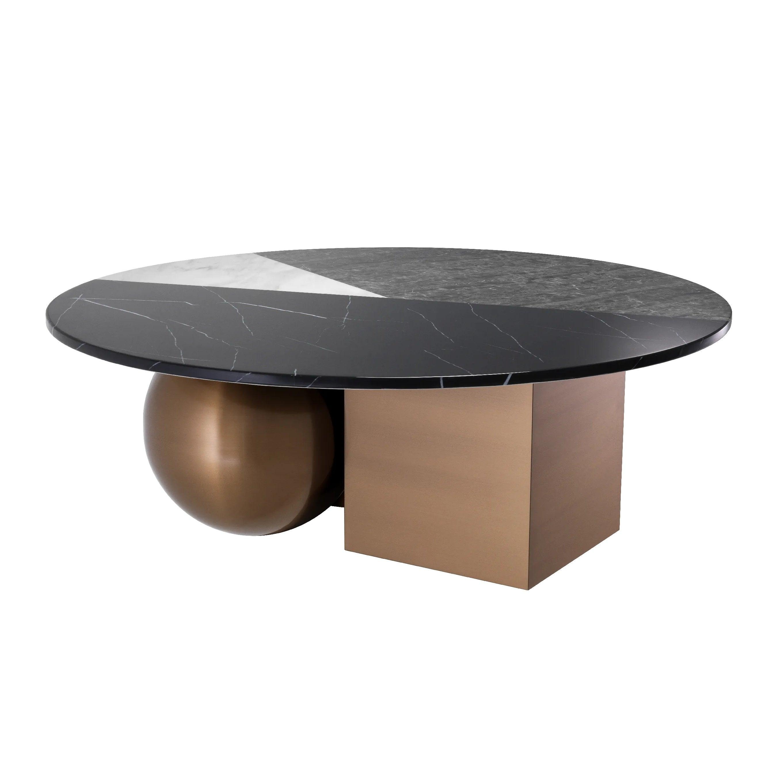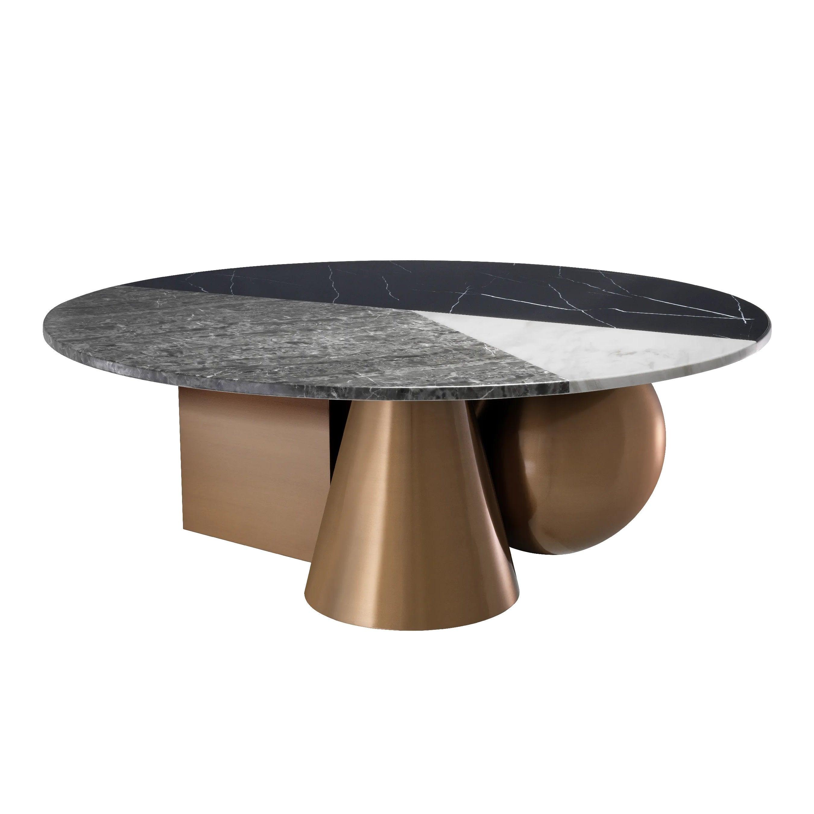 Coffee table Tricolori transfers interior design to a completely new level. Its unusual construction, consisting of three different geometric shapes: a cube, a cone and a ball, is a brave and intriguing nod to modern art. Finishing from elegant brushed copper gives it depth and adds an accent of luxury, making this table a center of attention in every room.