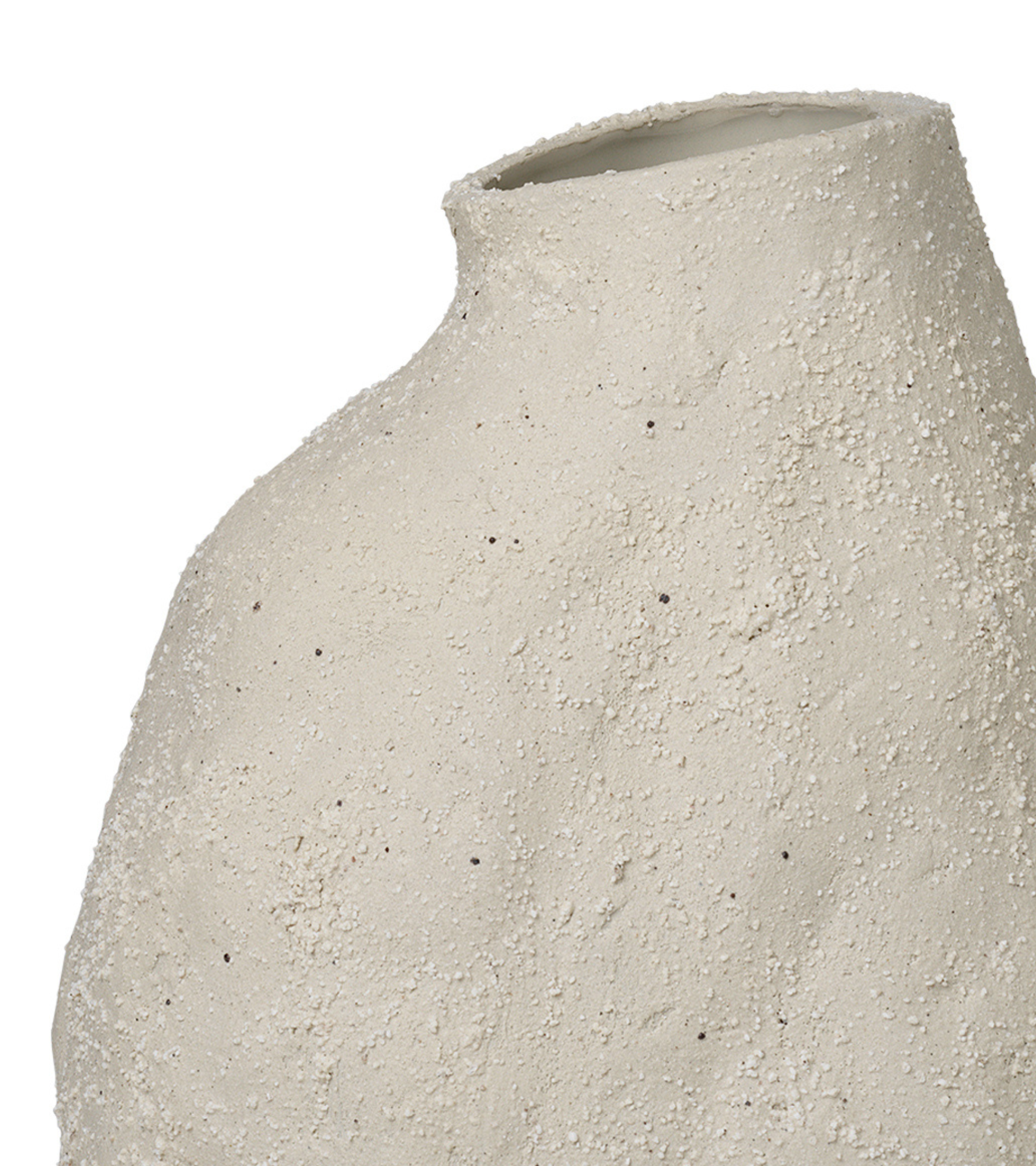 Vase Vulca is a unique addition to any interior, inspired by the raw beauty of volcanic rocks. Its fluid, organic shape and grainy, irregular surface catch the eye and create a distinctive atmosphere. Made of stoneware and coated with off-white glaze, the vase serves as the perfect backdrop for fresh or dried floral arrangements, but also stands out beautifully as a solo decorative piece.