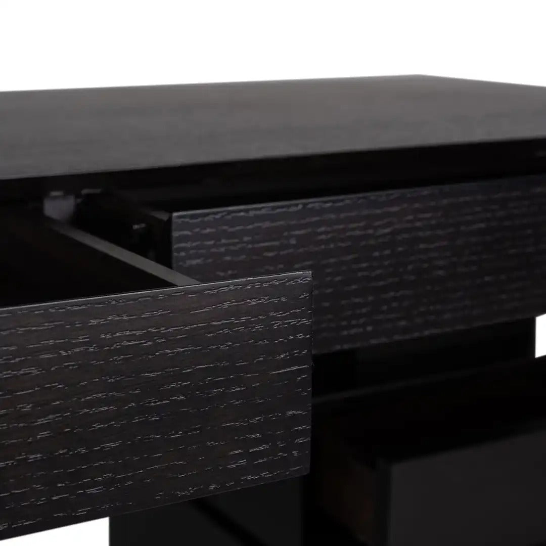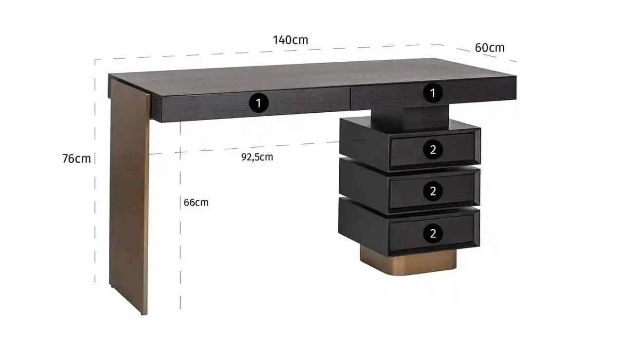 Stylowe biurko Connar o wyrazistej formie to idealna propozycja dla miłośników nowoczesnych wnętrz z odrobiną luksusu. Czarne, matowe wykończenie w połączeniu ze złotym detalem nadaje meblowi ekskluzywny charakter, który świetnie odnajdzie się zarówno w przestrzeni biurowej, jak i w domowym gabinecie. Praktyczne szuflady zapewniają miejsce do przechowywania najpotrzebniejszych akcesoriów, a masywna forma gwarantuje stabilność i komfort użytkowania.