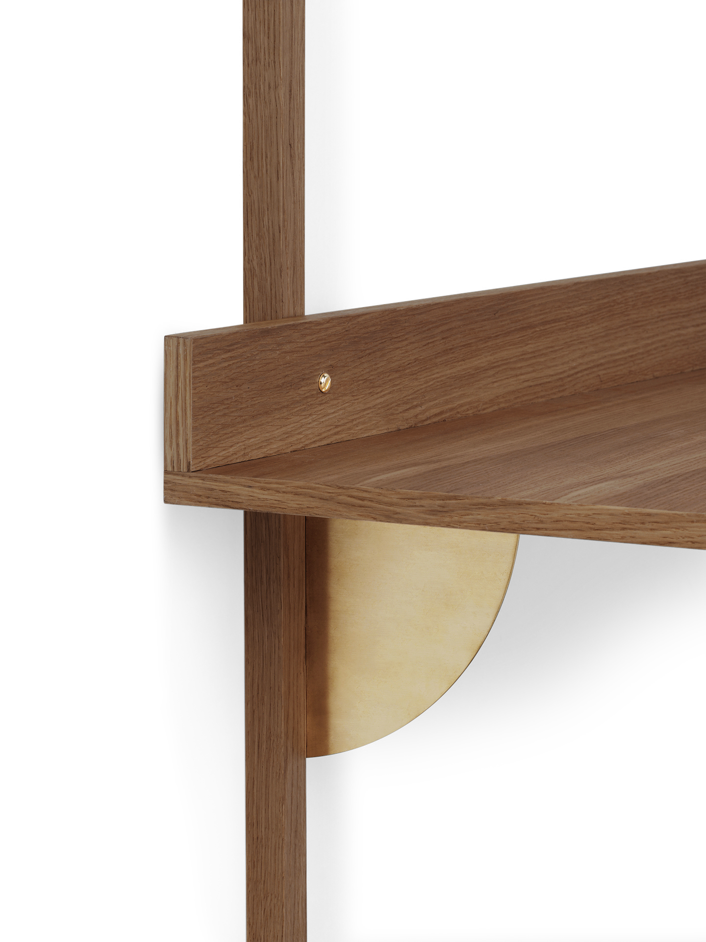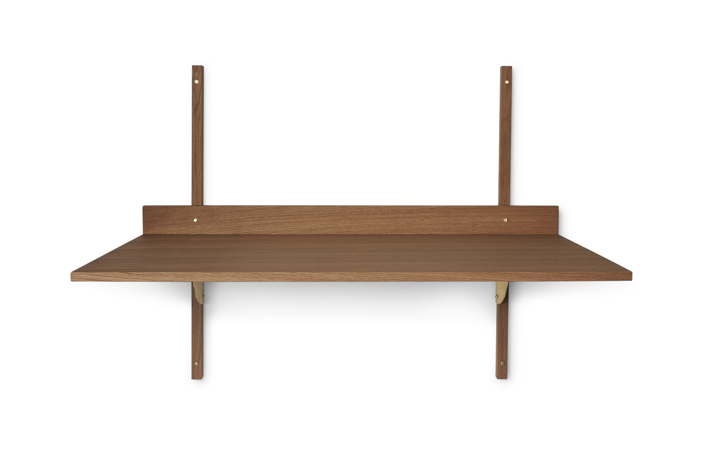 Biurko Sector to elegancka i nowoczesna interpretacja stylu mid-century, łącząca minimalistyczną formę z ciepłem naturalnych materiałów. Wersja w wykończeniu z dymionego dębu, uzupełniona mosiężnymi wspornikami, wprowadza do wnętrza przytulny, ale zdecydowany charakter. Krótki rant przy tylnej krawędzi blatu tworzy subtelną przestrzeń na notatki, pocztówki lub inspirujące zdjęcie.