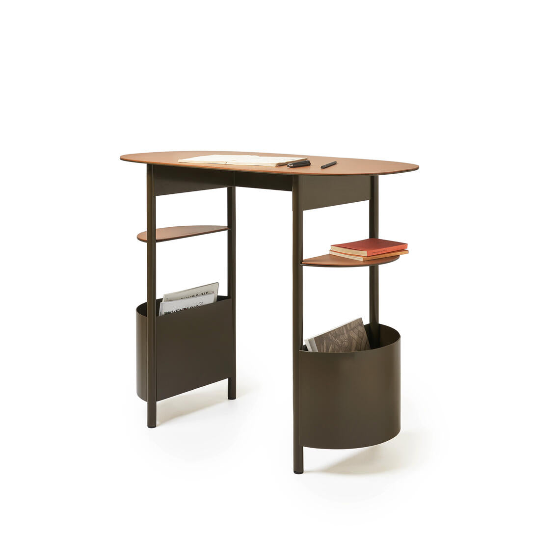 Biurko Vanilla autorstwa Raffaelli Mangiarotti to harmonijne połączenie subtelnego designu i praktycznej funkcjonalności. Zaokrąglona forma, brak ostrych krawędzi i miękkie linie sprawiają, że mebel staje się delikatnym akcentem w każdej przestrzeni – od przedpokoju, przez sypialnię, aż po nowoczesne biuro. Czarna stalowa konstrukcja i wykończenie z regenerowanej skóry w kolorze ciemnego brązu nadają całości luksusowego, a jednocześnie stonowanego charakteru.