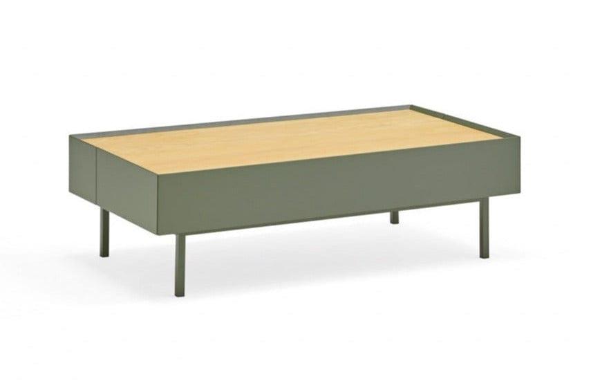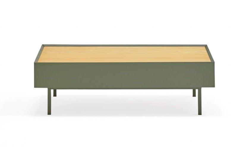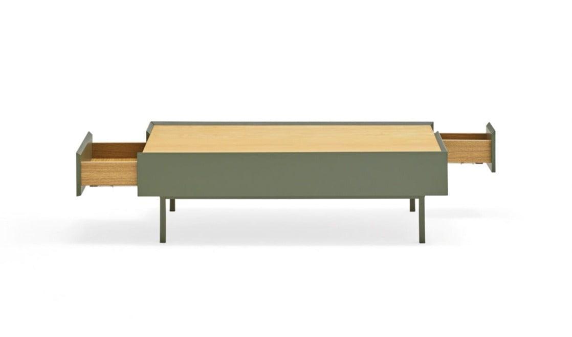 Elegancki stolik kawowy Arista jest połączeniem stylu minimalistycznego oraz skandynawskiego. Naturalne drewno znajdujące się na blacie oraz zielona konstrukcja sprawiają, że stolik kawowy świetnie się sprawdzi zarówno we wnętrzu urządzonym w stylu boho, jak i japandi.