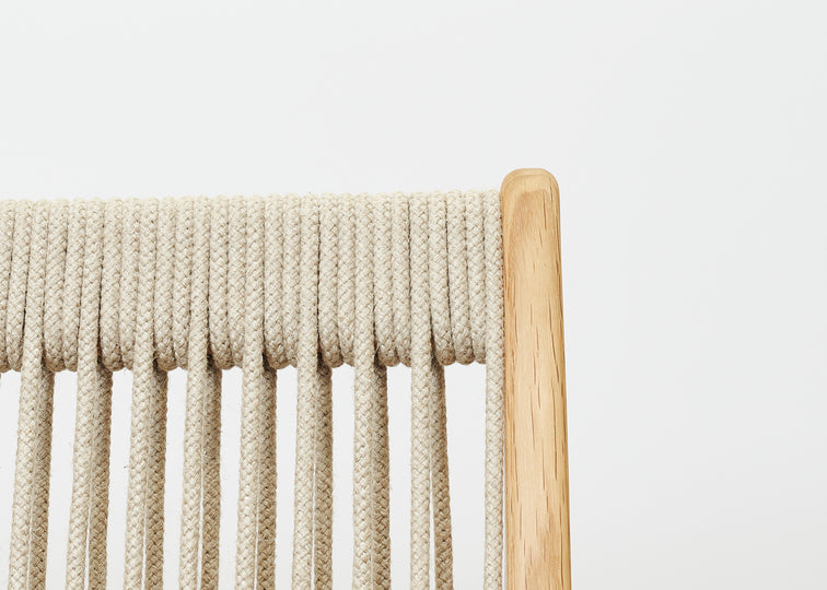 Fotel MR01 to debiutancki projekt duńskiego projektanta Mathiasa Steena Rasmussena, który stanowi połączenie rzemiosła, komfortu i zrównoważonego podejścia do designu. Zaprojektowany z myślą o relaksie i medytacji, fotel wyróżnia się lekką wizualnie i fizycznie konstrukcją oraz prostą formą. Trójkątna rama z litego drewna – dostępna w wersji z olejowanego orzecha amerykańskiego lub dębu – została wykonana bez użycia śrub, a siedzisko i oparcie powstały z 90 metrów ręcznie plecionego sznurka lnianego, co nadaje całości poczucie lekkości i unoszenia się nad ziemią.
