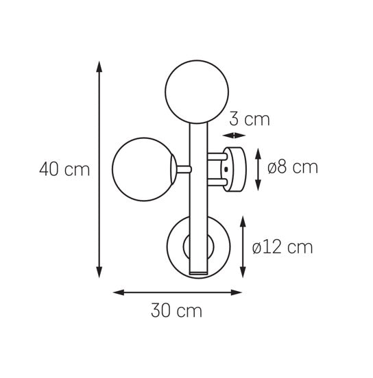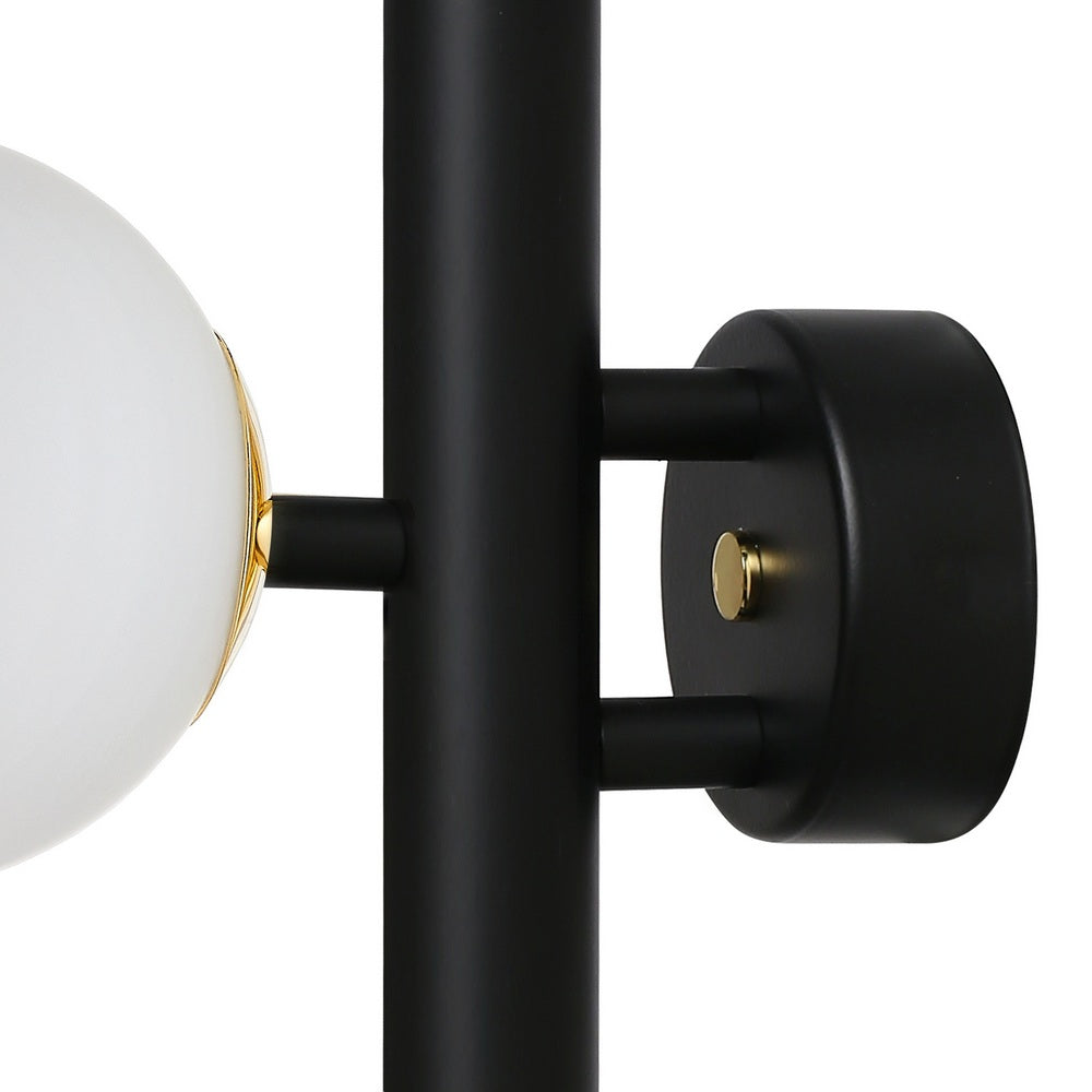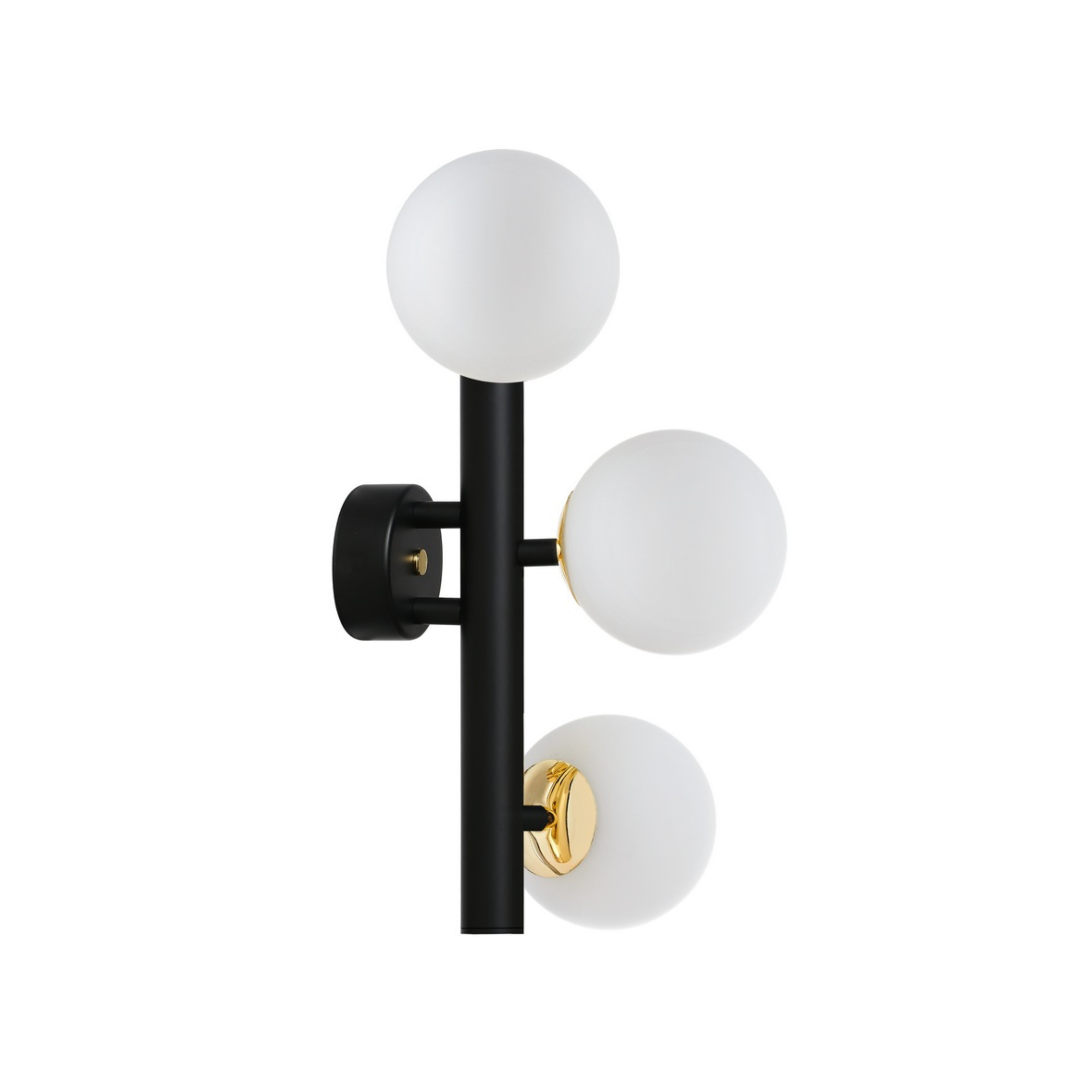 Wyjątkowy kinkiet Cumulus w wersji czarnej ze złotymi detalami to stylowa propozycja oświetlenia ściennego do wnętrz eleganckich, nowoczesnych i eklektycznych. Trzy mleczne, szklane klosze umieszczone zostały na pionowym stelażu w głębokim, matowym czarnym kolorze, który przełamują subtelne, złote akcenty dodające lampie biżuteryjnego wyrazu.