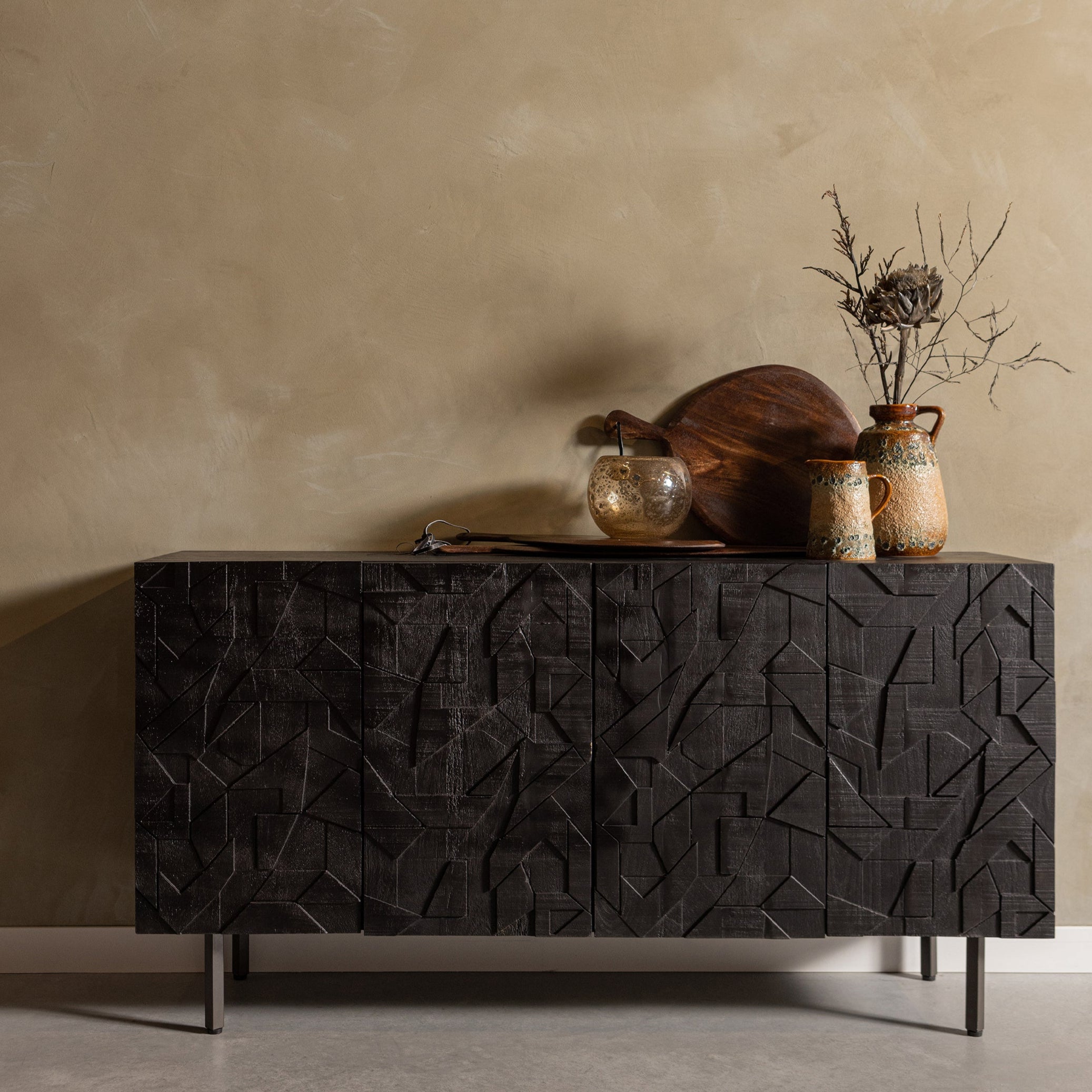 Komoda Counter to wyrazisty mebel o artystycznym charakterze, który przyciąga uwagę kunsztownie rzeźbionym frontem. Unikalne zdobienia wykonane w naturalnym drewnie mango nadają jej wyjątkowego wyglądu – każdy egzemplarz ma nieco inny układ słojów, co czyni go jedynym w swoim rodzaju.