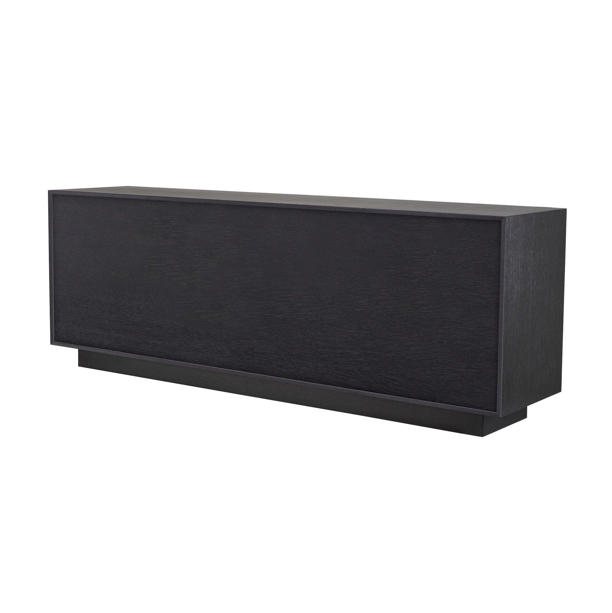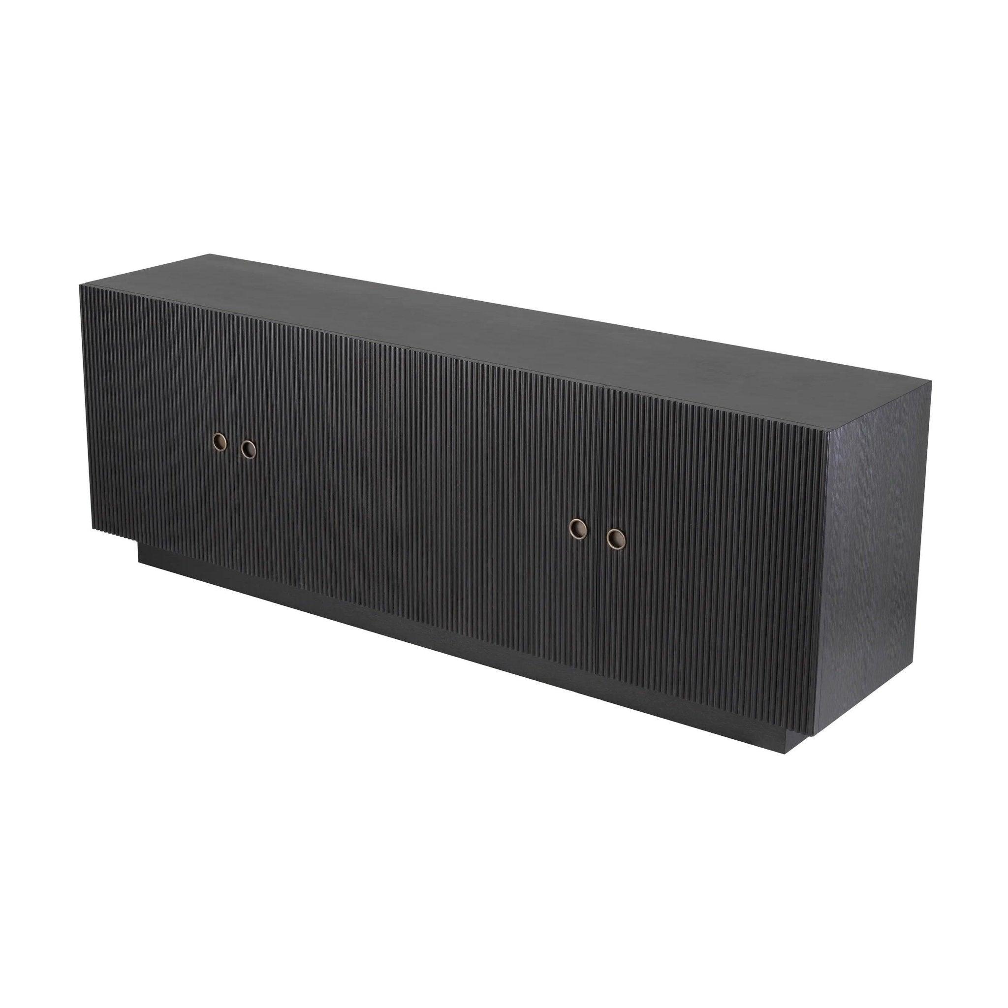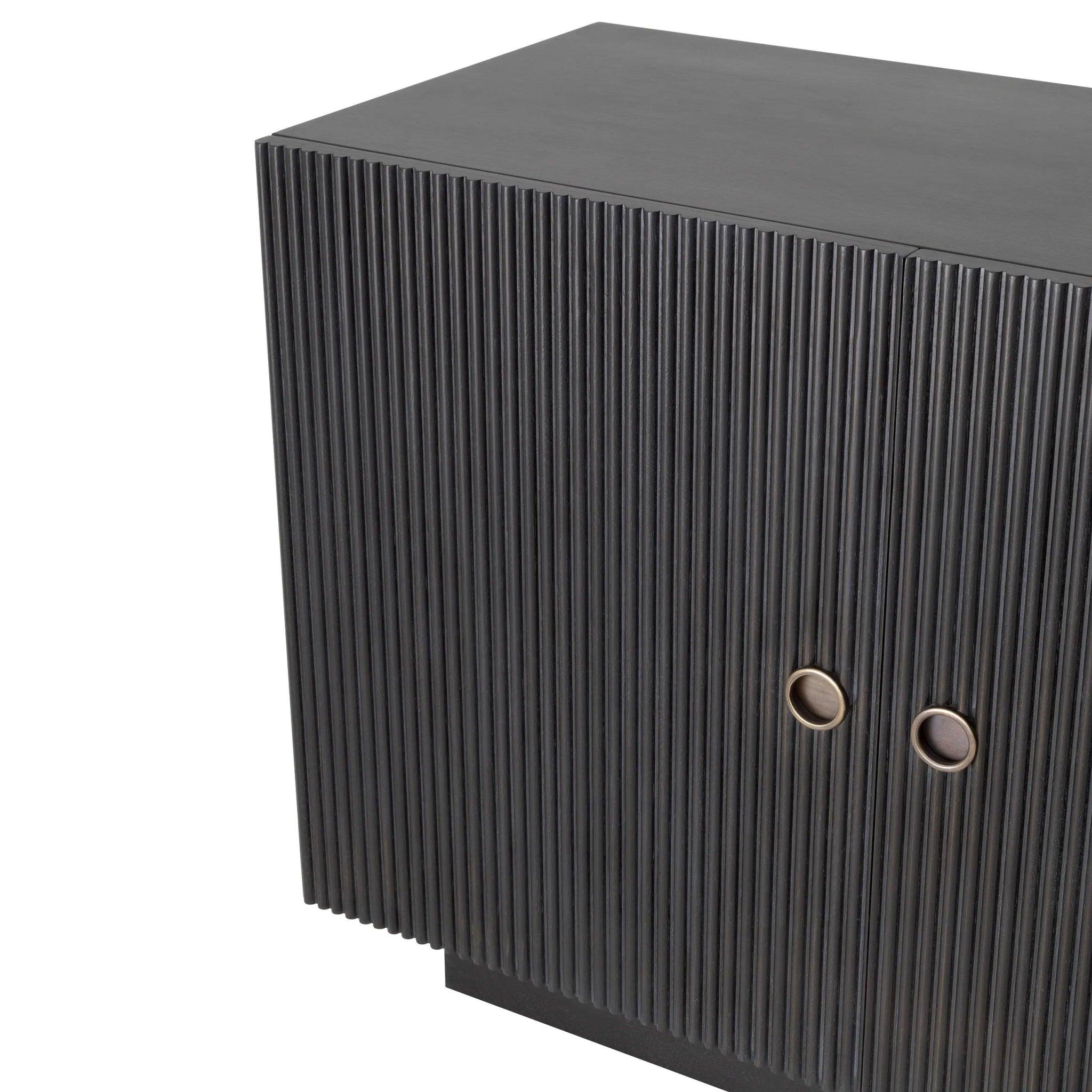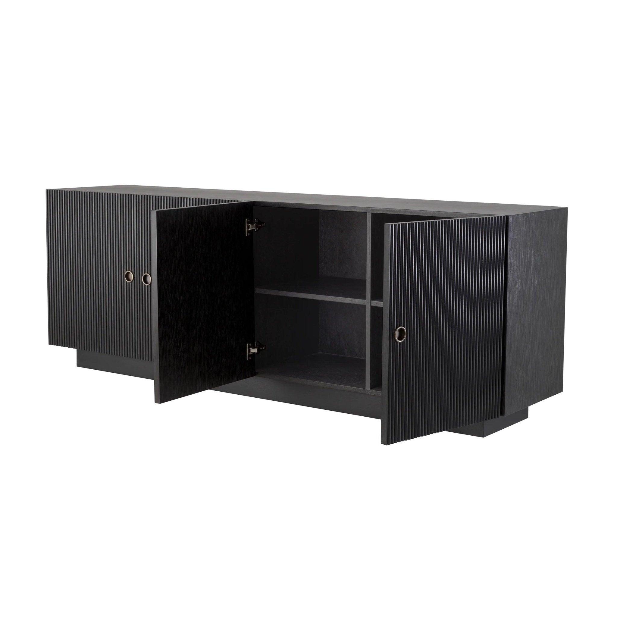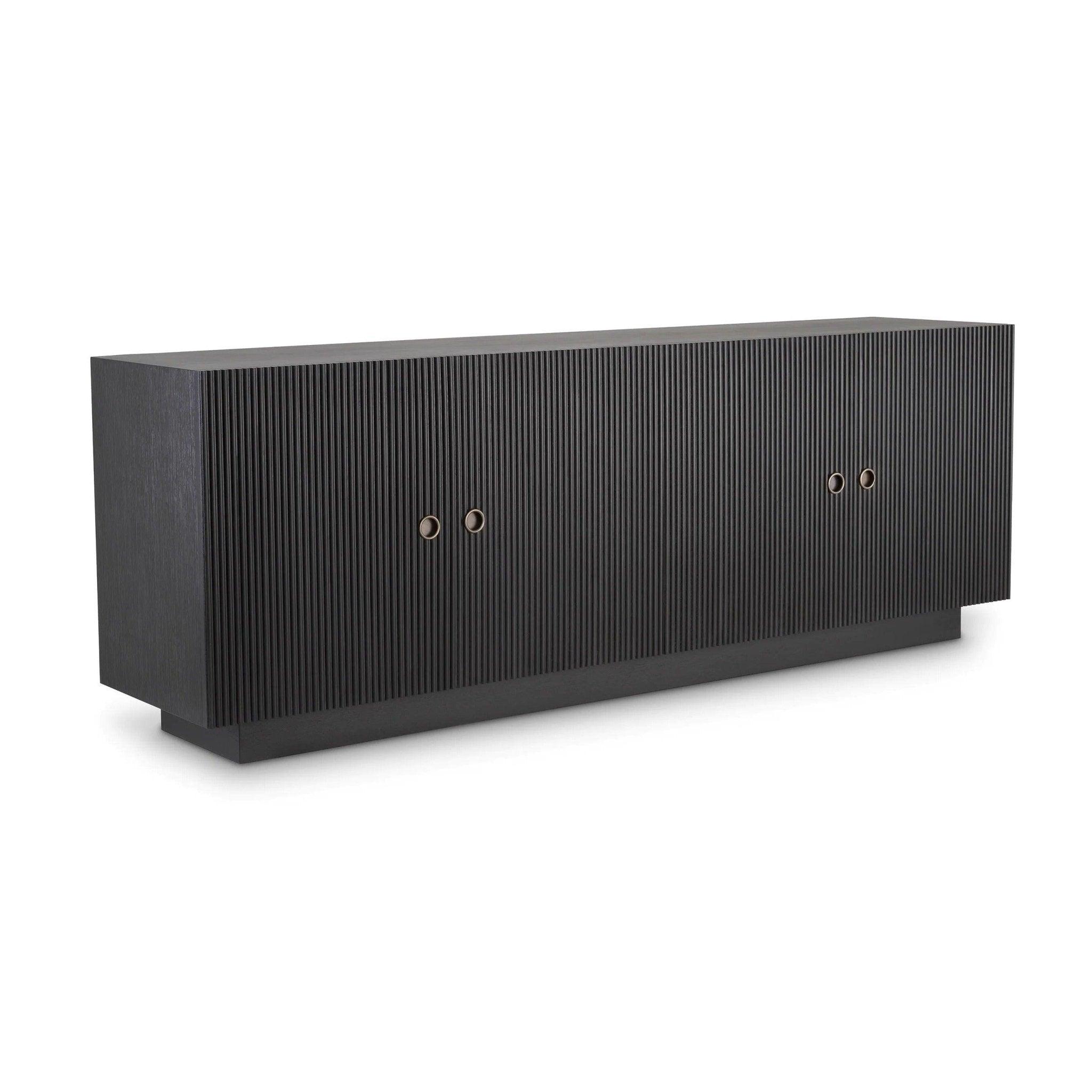 Elegancja spotyka styl w komodzie Dimitrios, której prążkowane panele drzwiowe niosą ze sobą subtelną nutę nowoczesnego szyku z lat pięćdziesiątych. Inspirowany stylem vintage, mebel ten charakteryzuje solidna obudowa z fornirem dębowym w kolorze grafitowo-szarym, co nadaje mu unikalny, elegancki wygląd.