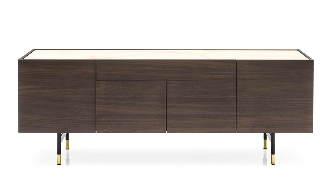 Całość uzupełnia blat wykonany z ceramiki oraz metalowa podstawa, która dodaje konstrukcji nowoczesnego wyrazu i stabilności. Komoda Horizon dzięki swoim dużym rozmiarom doskonale sprawdzi się w przestronnych jadalniach i salonach, oferując nie tylko funkcjonalne miejsce do przechowywania, ale także efektowny element aranżacji wnętrza.