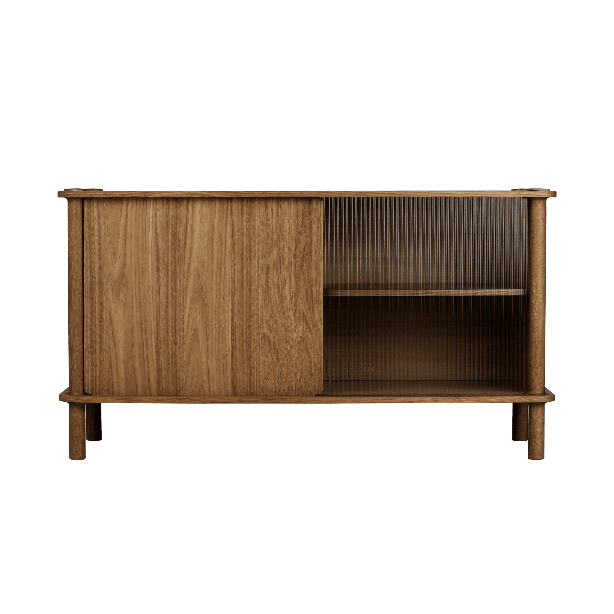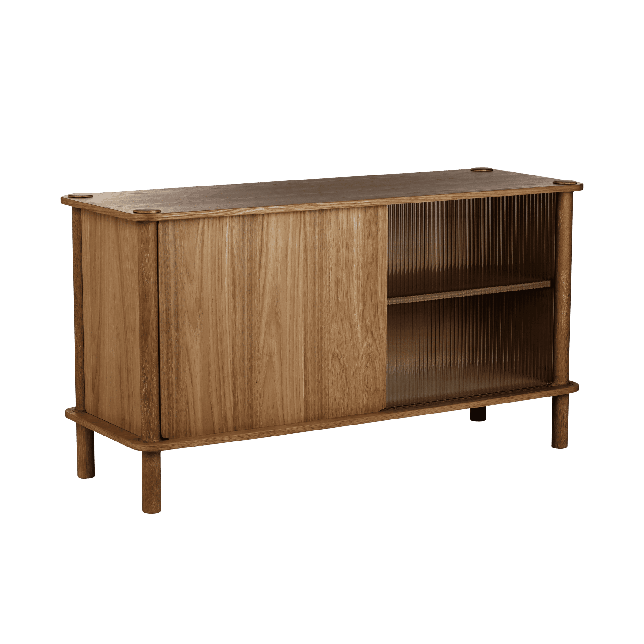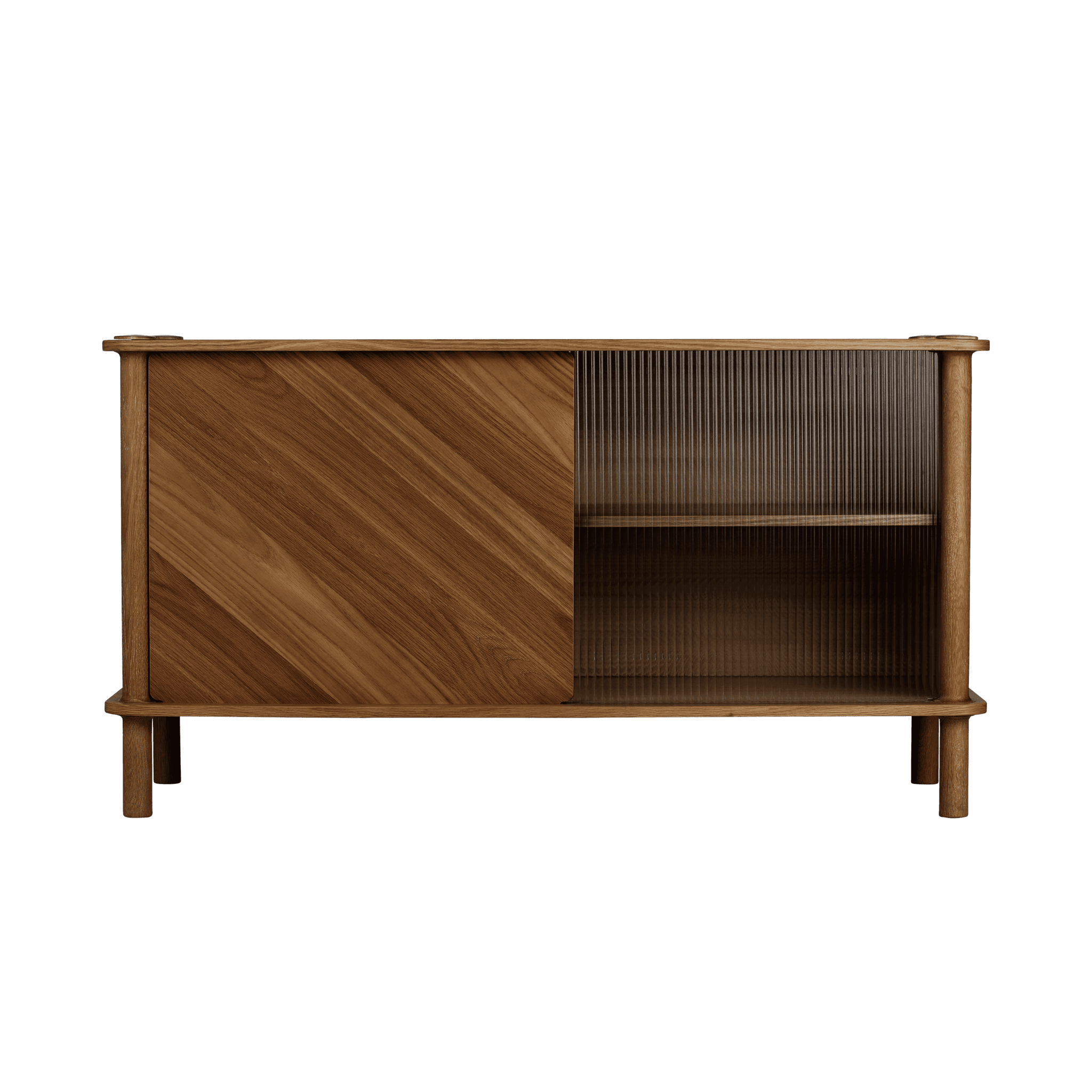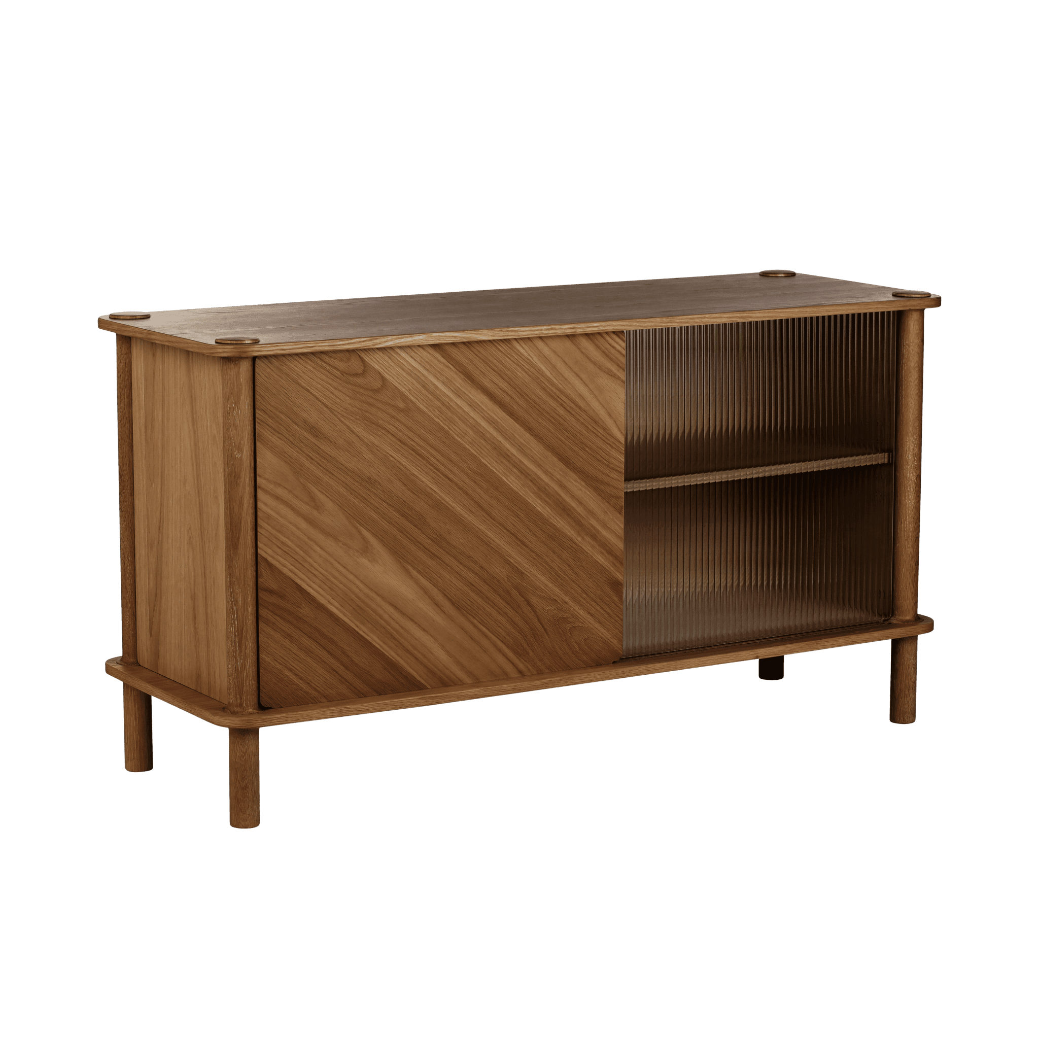 Dzięki drzwiom komody wykonanym z ryflowanego szkła lub drewna dębowego, można spersonalizować i podnieść poziom estetyki wnętrza. Drzwi można wymieniać i dopasowywać, tworząc efekt harmonizujący z każdym stylem. Drewniane drzwi posiadają dwustronne wykończenie: jedna strona z fornirowanym panelem ukośnym, nadająca meblowi wyjątkowy charakter, a druga strona z okleiną pionową, zapewniająca ponadczasowy wygląd.
